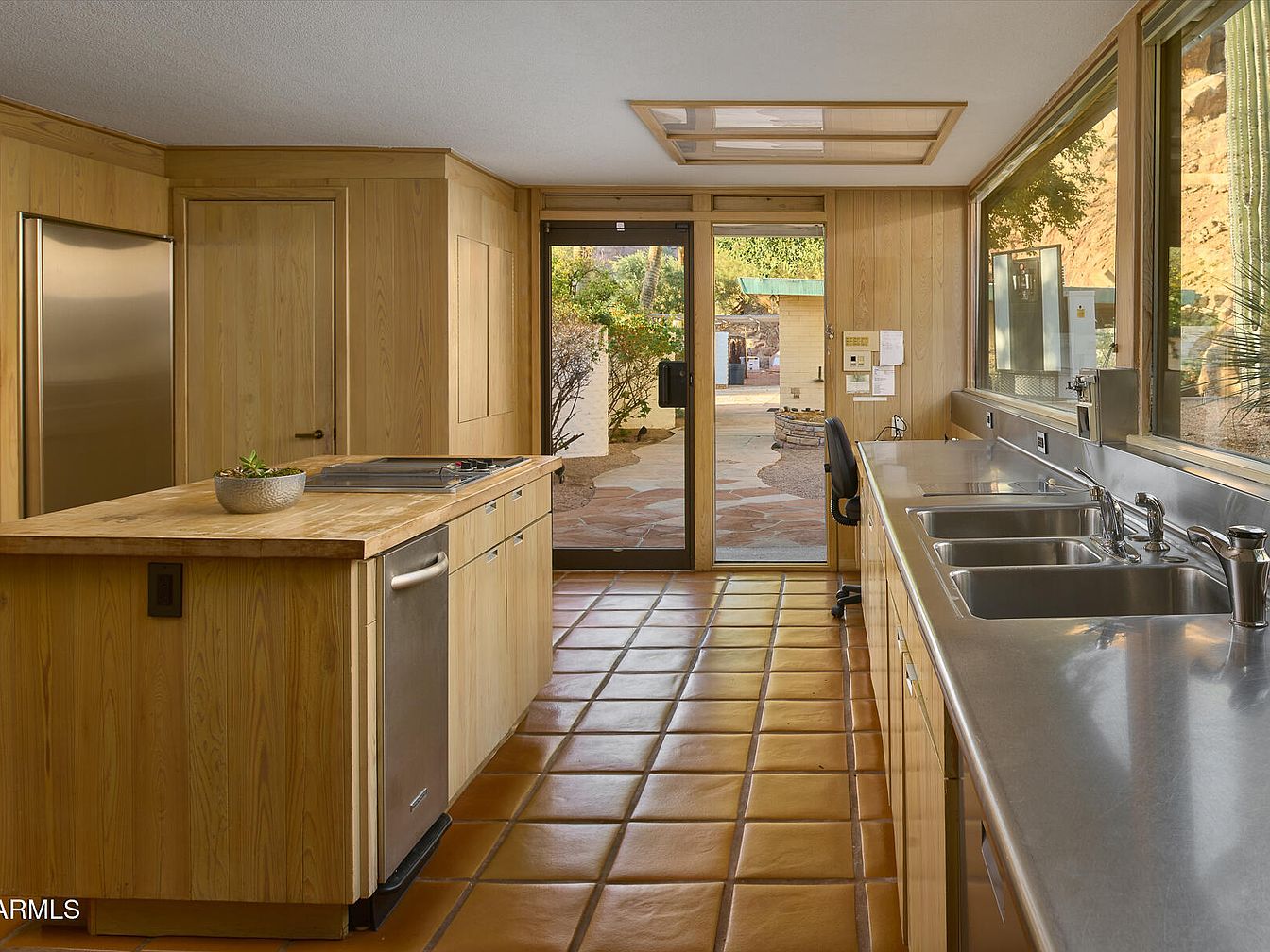 This kitchen showcases a harmonious blend of natural wood and sleek stainless steel, creating a warm and inviting atmosphere. The generous island, adorned with a wooden countertop, serves as both a functional workspace and a casual dining spot. Ample cabinetry complements the clean lines of the design, offering plenty of storage for kitchen essentials. Large windows flood the space with natural light, connecting the indoors to the outdoor patio. With durable terracotta tiles underfoot, this family-friendly area combines practicality with style, making it perfect for both culinary adventures and social gatherings.
