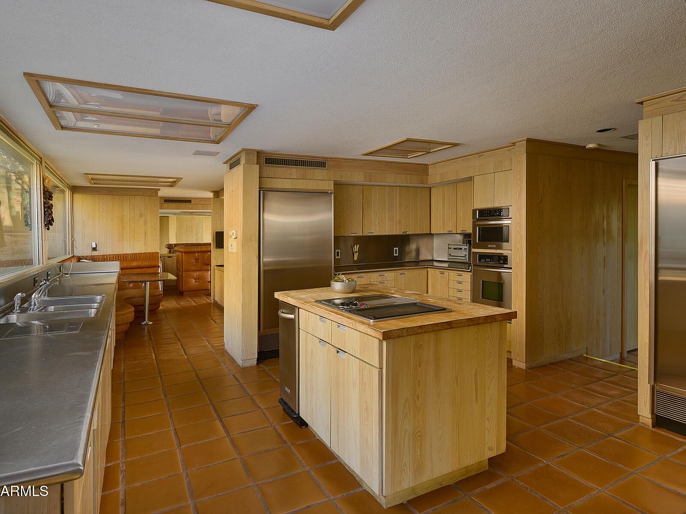 This inviting kitchen features a harmonious blend of warm wood grain cabinetry and steel appliances, creating a functional yet stylish workspace. The open layout allows for seamless movement, perfect for family gatherings or casual meals. A central island with a wooden countertop serves as a multi-purpose hub, suitable for meal prep or breakfast seating. Terracotta flooring adds a rustic charm, while skylights flood the area with natural light, enhancing the warm tones. Ample counter space and modern fixtures ensure practicality, making this kitchen an ideal environment for both cooking and socializing.