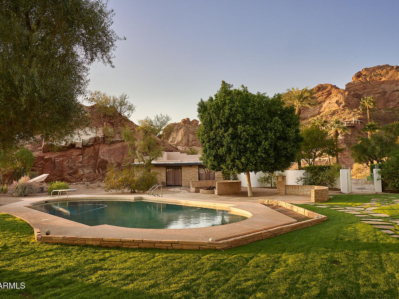 This stunning backyard showcases a serene poolside retreat, enveloped by lush green lawns and vibrant landscaping. The gently curving stone edges of the pool harmonize beautifully with the soft golden hues of the surrounding stonework. Towering above is a majestic tree, offering shade and a tranquil ambiance. The home’s modern architecture blends seamlessly with the natural rock formations in the background, adding an earthy charm. Pathways lined with natural stone lead to various gathering spots, promoting family-friendly outdoor activities. The warm and inviting atmosphere encourages relaxation and promotes a perfect setting for entertaining and enjoying nature.