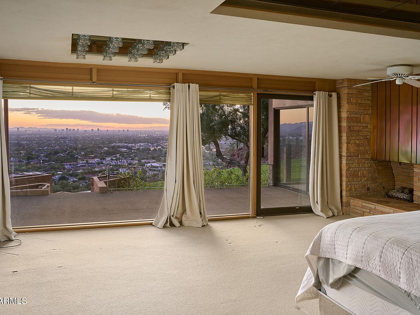 This spacious master bedroom seamlessly blends comfort and elegance with a stunning panoramic view. The subtle color palette of soft creams and earthy tones creates a serene atmosphere. A plush king-sized bed is the focal point, adorned with decorative pillows that add a pop of color. Architectural highlights include built-in shelving and expansive windows framed by soft curtains, allowing natural light to flood the space. The luxurious carpet enhances warmth, making it a cozy retreat. A ceiling fan adds modern convenience, and the mirrored accents provide a sense of openness, while the brick wall adds enduring character to the room.