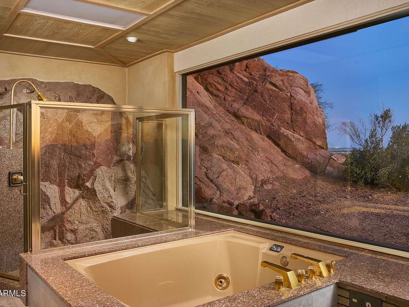 This exquisite bathroom offers a harmonious blend of natural beauty and modern design, emphasizing comfort and tranquility. The space features a luxurious soaking tub, perfectly positioned near a large window that frames stunning rock formations outside. Elegant granite countertops and refined gold fixtures add sophistication, while the glass shower enclosure showcases sleek lines and minimalist aesthetics. The warm wooden ceiling enhances the cozy atmosphere, making it an inviting retreat. With large windows bathing the area in natural light, this bathroom is designed to create a serene escape for relaxation and rejuvenation, perfect for families seeking a tranquil haven.