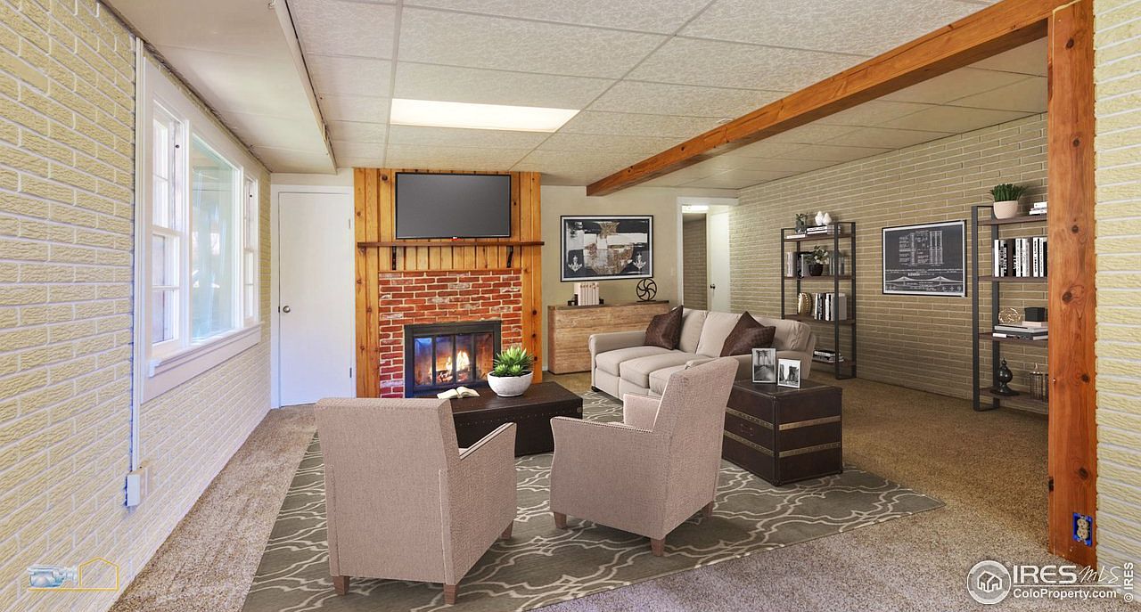 This inviting living room features a harmonious blend of comfort and style, anchored by a traditional brick fireplace that enhances the cozy atmosphere. The layout facilitates social interaction, with plush seating arranged around a chic coffee table, perfect for family gatherings. Soft beige walls paired with warm wooden beams create a welcoming ambiance, while large windows bathe the space in natural light. The earthy color palette is complemented by decorative accents, including framed artwork and potted plants, elevating the aesthetic. A mix of modern and rustic furniture ensures functionality while maintaining an inviting, homey feel.