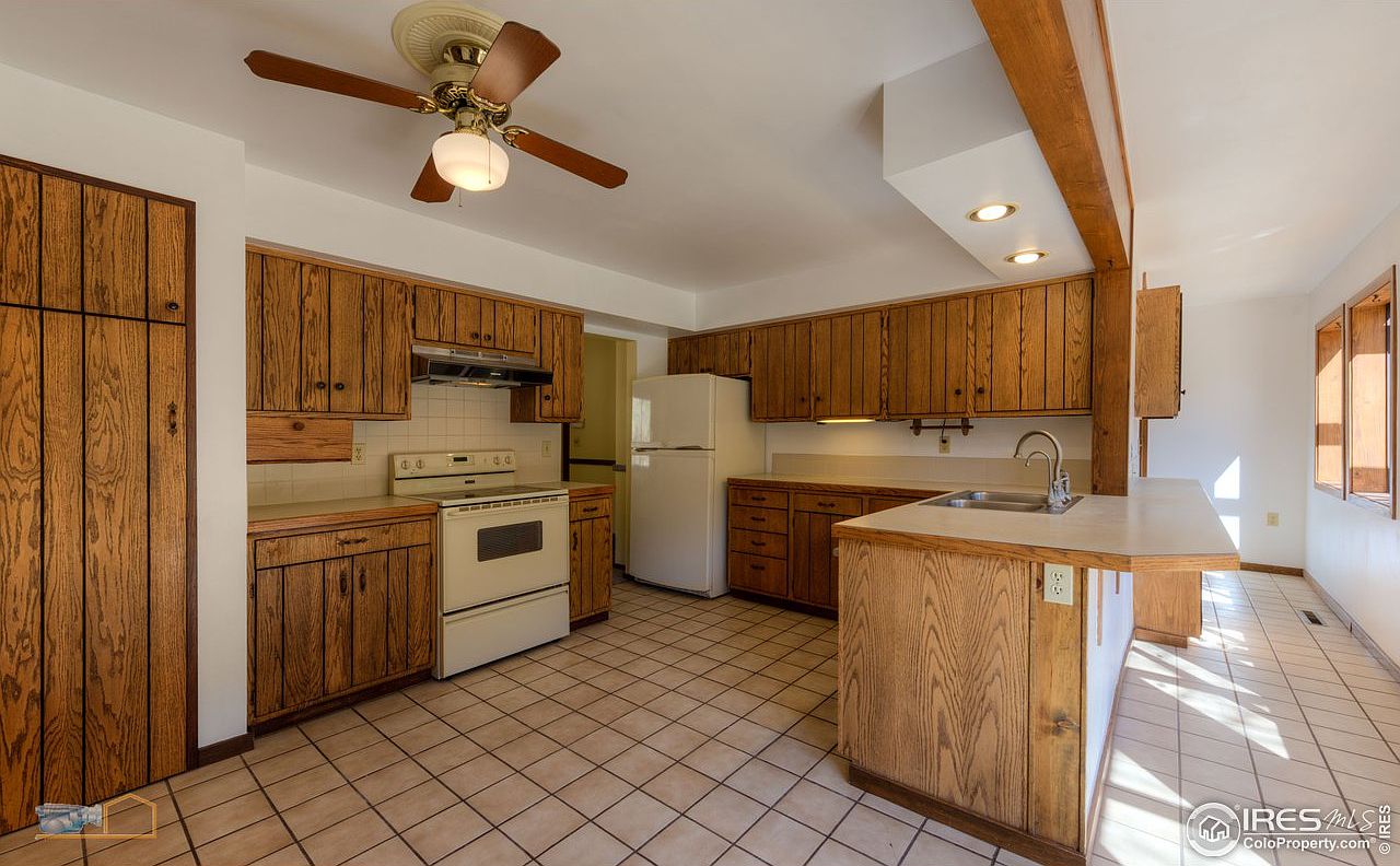 This spacious kitchen boasts a warm, rustic aesthetic with rich oak cabinetry that provides ample storage. The layout features a central island with a sleek countertop perfect for casual dining or meal prep. Neutral-colored tiles adorn the floor, contrasting beautifully with the wood grain, while natural light floods the space through nearby windows. An overhead ceiling fan enhances airflow, ensuring comfort during family gatherings. The connectivity to adjoining areas makes this kitchen inviting, while the functional appliances, including a classic white refrigerator and range, blend seamlessly into the design, making it a practical hub for family life.