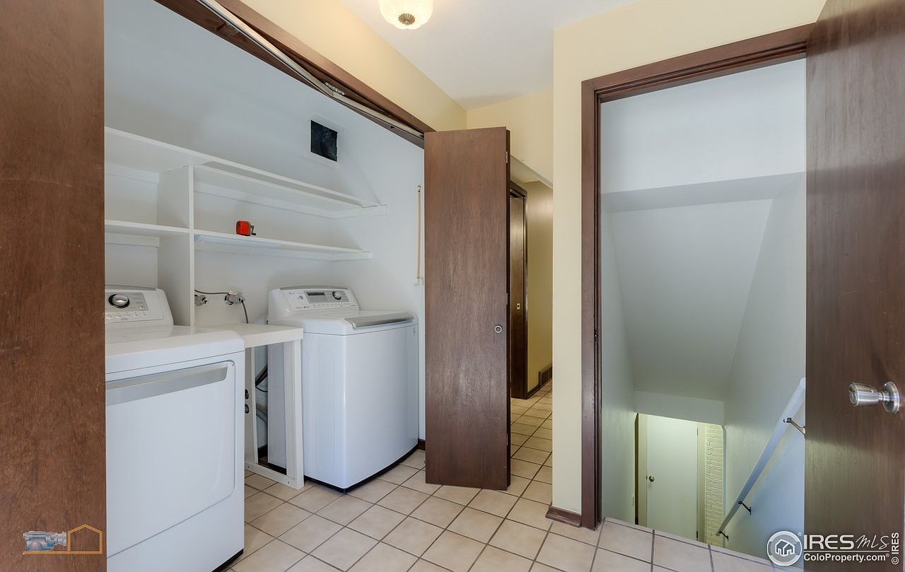 This cozy laundry room features efficient appliance placement with modern, white washing machines neatly aligned against the wall. A light, neutral color scheme enhances the airy feel, complemented by sunlit beige tiling that flows seamlessly underfoot. The room boasts built-in shelving, providing ample storage for detergents and household supplies, keeping the space tidy and organized. Simplistic wooden doors frame entrances, while a subtle overhead light fixture provides illumination. Great for family life, this functional space offers easy access to the adjoining areas, making laundry chores more convenient and less daunting.