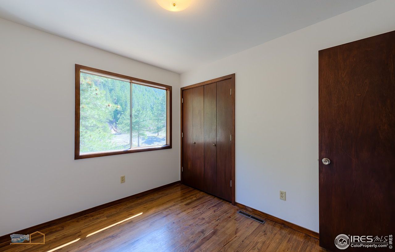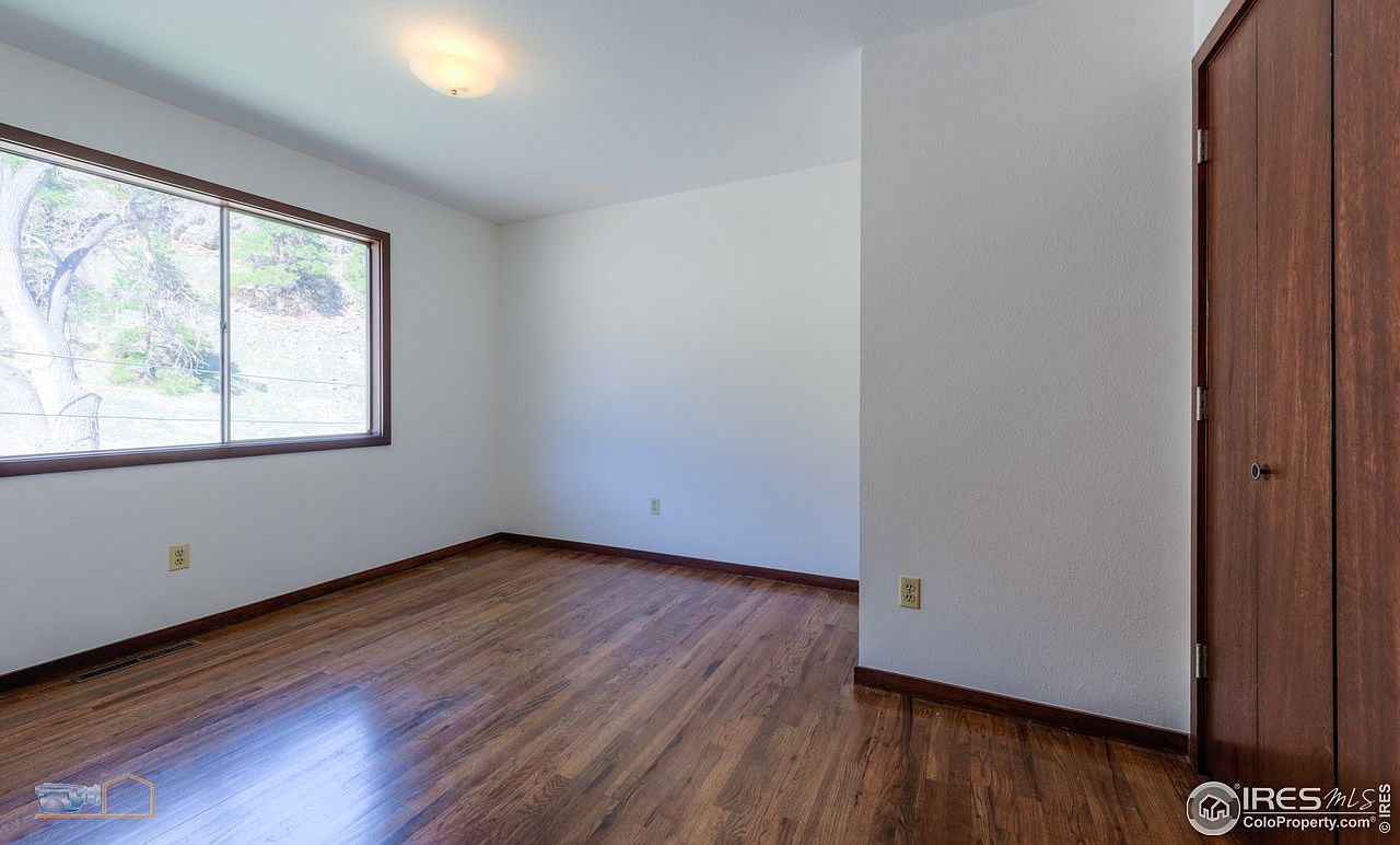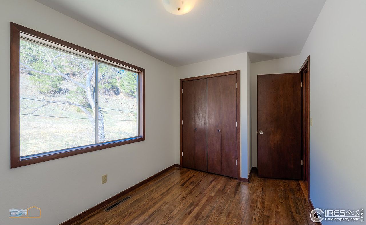 This cozy bedroom showcases a warm and inviting layout with wooden flooring that enhances the homey feel. The large window provides ample natural light and offers a stunning view of the serene outdoors, creating a tranquil atmosphere. Tasteful brown trim framing the window complements the rich, dark wood of the closet doors, adding a sophisticated touch. The walls are painted in a soft, neutral tone, allowing for versatility in décor. With a practical design and family-friendly features, this room is ideal for relaxation or study, making it a perfect retreat for all ages.