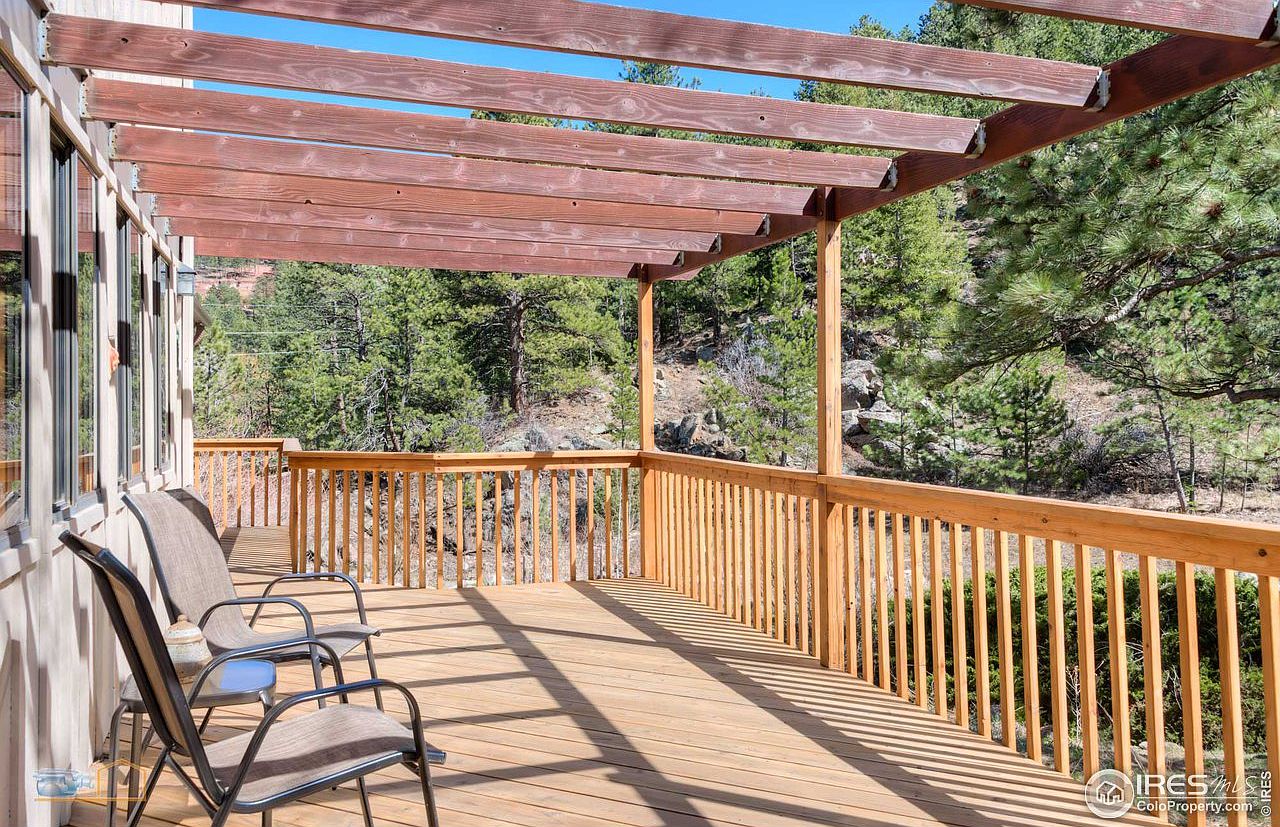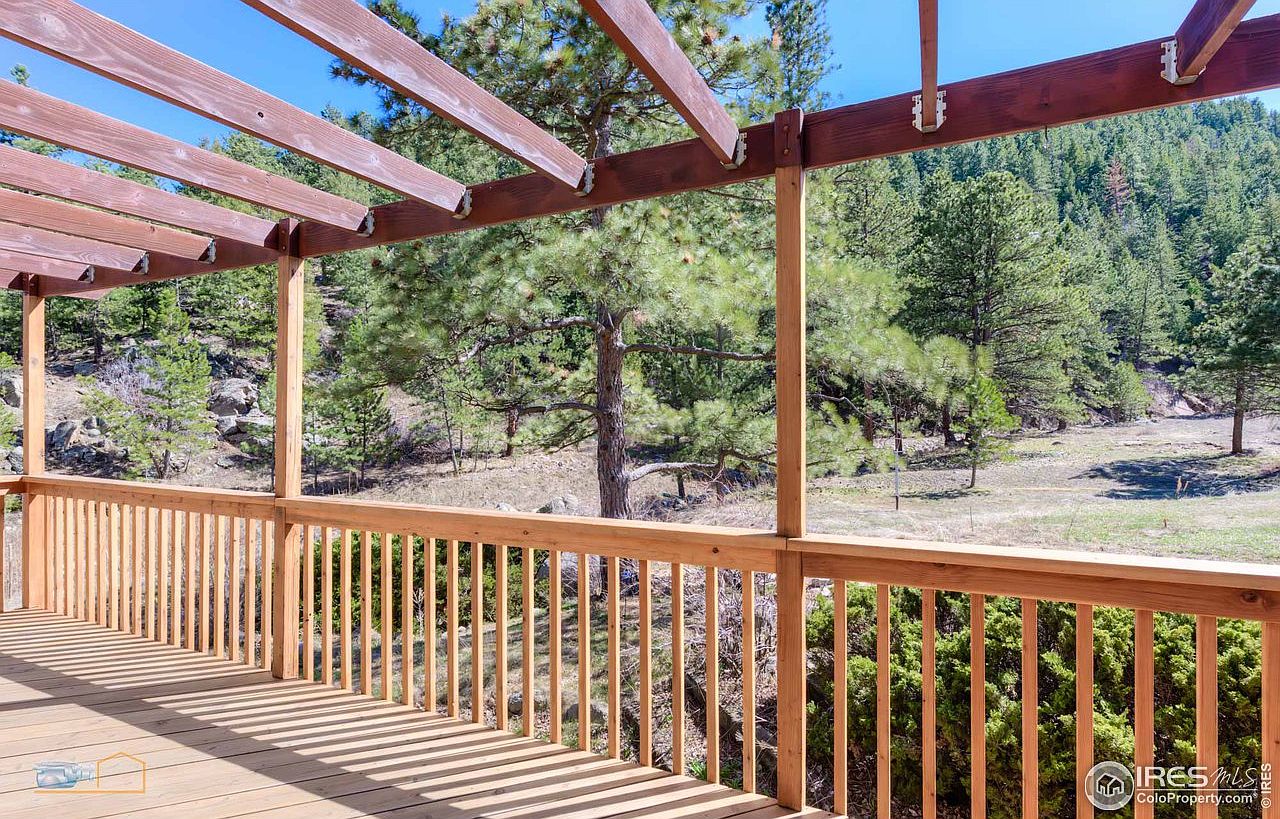 This charming outdoor deck offers a seamless connection to nature, framed by sturdy wooden railings and a open-beam pergola overhead. Sunlight filters through the overhead slats, creating a warm, inviting ambiance. The expansive decking provides ample space for outdoor furniture, making it an ideal setting for family gatherings or morning coffees. Surrounded by lush greenery and tall trees, the deck boasts a tranquil view of the natural landscape, enhancing its peaceful atmosphere. Family-friendly features include safety railings and spacious flooring, perfect for children to play while enjoying the fresh air and scenic surroundings.