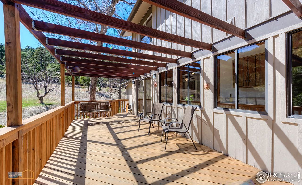 This inviting deck area seamlessly combines indoor and outdoor living, featuring a durable wooden floor that extends the comfort of the home into nature. A sturdy wooden railing enhances safety while offering uninterrupted views of the surrounding landscape. The trellis overhead adds a touch of charm, providing partial shade to relax under the sun. Two comfortable chairs beckon enjoyment, ideal for family gatherings or peaceful retreats. The neutral color palette complements the natural setting, while large windows in the adjacent home enhance light and openness. Perfect for entertaining or quiet mornings with coffee surrounded by tranquility.