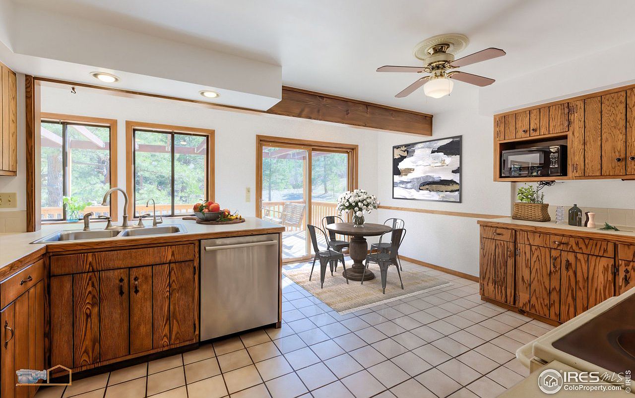 This inviting kitchen features a spacious layout, highlighted by natural wood cabinetry and modern appliances. The sleek countertops provide ample workspace, while the double sink overlooks a serene outdoor area through large windows, enhancing the light and airy atmosphere. A charming dining nook with a round table and stylish chairs invites family gatherings, making it a perfect spot for casual meals. Subtle earth tones in the tiled flooring and cabinetry create a warm, cohesive aesthetic. Architectural details like the decorative ceiling fan and wooden beams add character, emphasizing the kitchen’s family-friendly, functional design.
