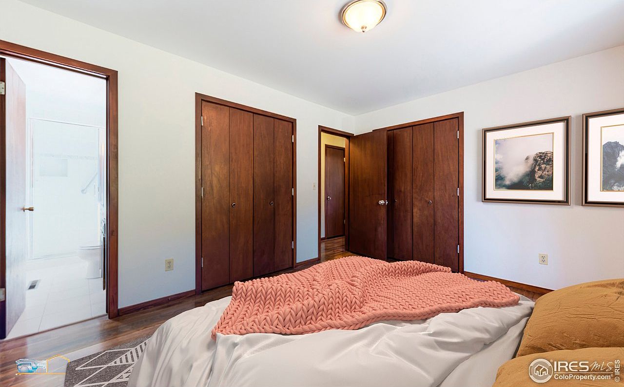 This inviting bedroom showcases a harmonious blend of warm wood tones and soft textiles, creating a welcoming atmosphere. The room features beautifully crafted wooden doors and trim, enhancing its cozy appeal. A plush bed adorned with a textured pink blanket offers a focal point, suggesting comfort and relaxation. Light, neutral walls illuminate the space, while the rich hardwood flooring adds warmth and earthy elegance. Framed landscape art complements the decor, linking nature with interior aesthetics. Family-friendly touches, like ample storage in built-in closets, ensure this room is not only stylish but also practical for everyday living.