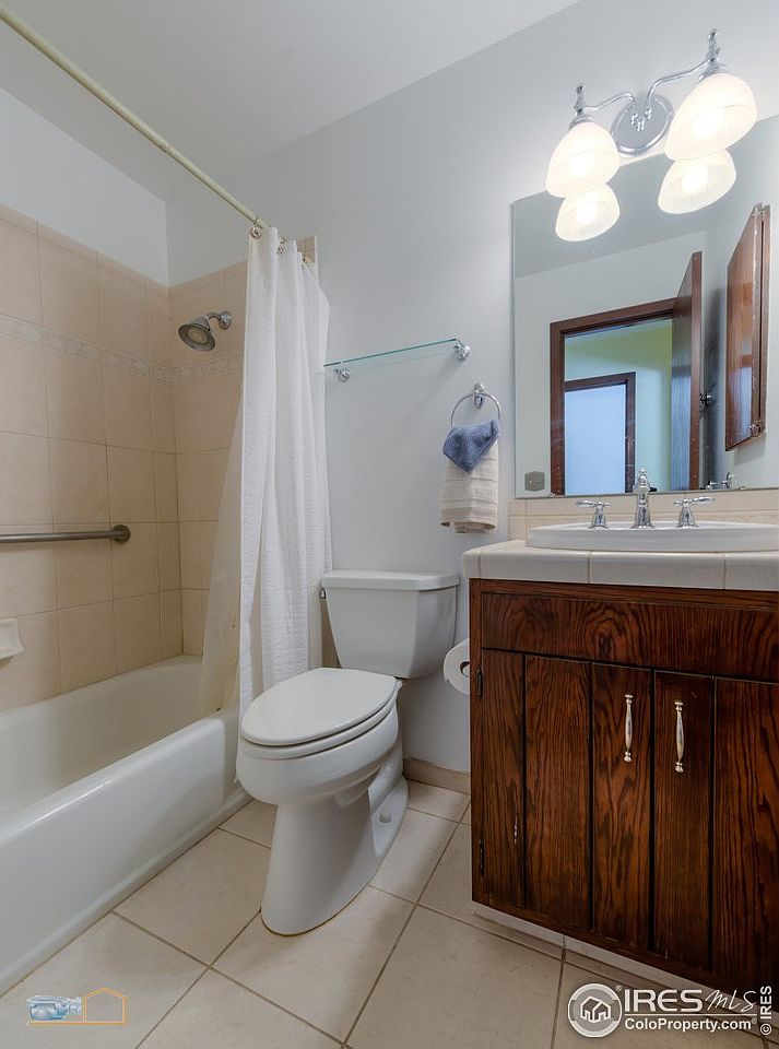 Bright and welcoming, this bathroom features a functional layout with both a bathtub and shower combination, perfect for family use. Light beige tiles harmonize with the white walls and a clean color palette, enhancing the spacious feel. The dark wood cabinetry adds an elegant contrast, housing essential conveniences, while a sleek counter accommodates dual sinks. Ample lighting, highlighted by a modern fixture, ensures a bright atmosphere. Practical amenities such as towel racks and a glass shelf provide additional storage and functionality. The inclusion of a privacy door and soft textiles contributes to a cozy and inviting environment.