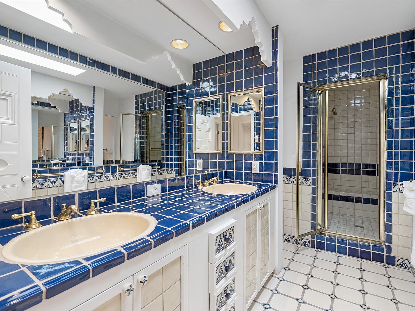 This vibrant bathroom features a striking blue tile design that creates a sense of calm and tranquility. The generous dual sink vanity, adorned with gold fixtures, offers both elegance and practicality, while providing ample space for family use. A skylight floods the area with natural light, enhancing the lively color scheme. The intricately patterned tiles continue onto the floor, adding visual interest, while the spacious shower area with glass doors promotes a modern feel. Framed mirrors amplify the room’s brightness, making this bathroom both a functional space and a tranquil retreat for the entire family.
