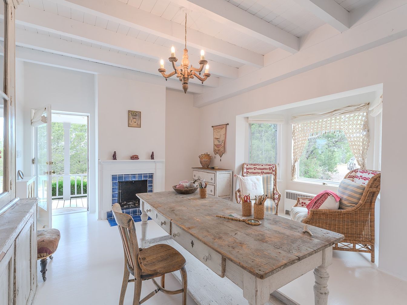 This charming dining room features a rustic wooden table that serves as a focal point, complemented by vintage wooden chairs that invite family gatherings. The room showcases whitewashed beams and light wood accents, enhancing the airy feel. Sunlight streams through large windows adorned with delicate lace curtains, framing serene views of the outdoors. A cozy seating area with wicker chairs and soft pillows invites relaxation and conversation. The blue-tiled fireplace adds a splash of color, while the overall palette of soft, neutral tones creates a warm and inviting atmosphere, perfect for family meals and entertaining guests.