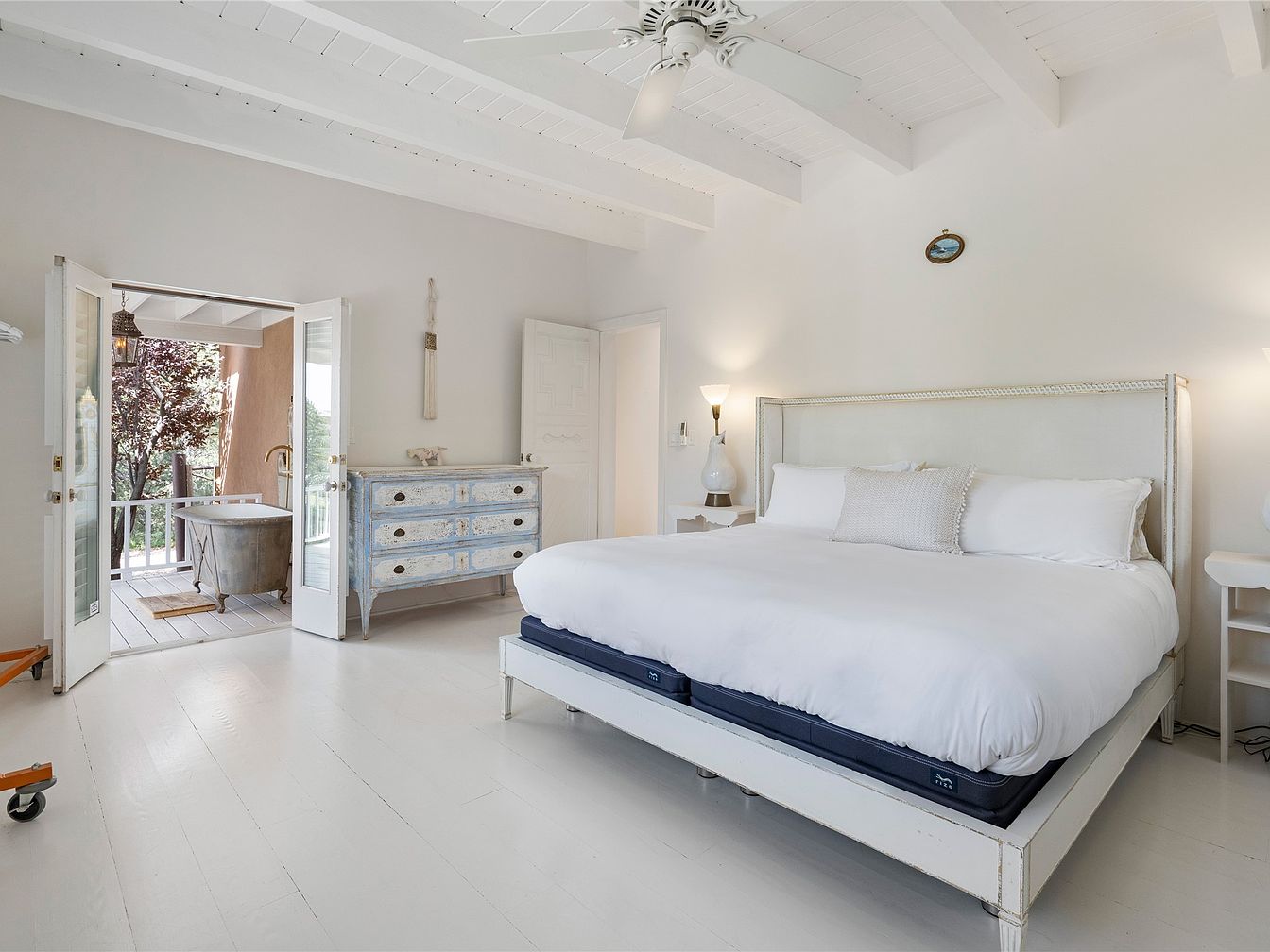 A serene master bedroom designed for relaxation and comfort, showcasing an elegant blend of modern and rustic elements. The crisp white walls and vaulted ceiling highlight the spaciousness, while exposed wooden beams add warmth and character. A luxurious king-sized bed, accentuated with plush pillows, invites restful nights. A charming blue-dresser complements the palette, offering storage while enhancing the room’s aesthetic. Opening to a private outdoor escape, the French doors lead to a tranquil patio, complete with a freestanding tub, perfect for soaking up nature. Soft lighting and minimalist decor create a warm, inviting atmosphere, ideal for family moments.