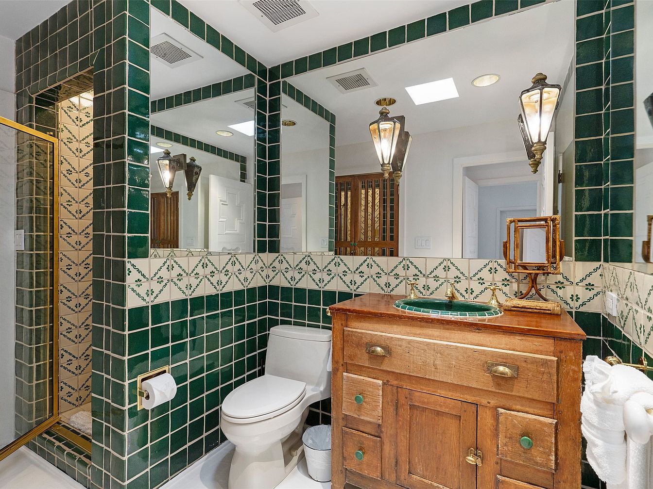 This thoughtfully designed bathroom features striking emerald green tile, creating a vibrant and inviting atmosphere. The layout includes a spacious shower area, subtly enclosed with a glass door, combined with a classic wooden vanity that adds warmth and character. Unique gold fixtures complement the rich tile work, enhancing the luxurious feel. The cream-colored tile at the midheight introduces a light contrast, adorned with delicate green patterns, which harmonizes with the overall color scheme. Two elegant wall sconces provide ample lighting, while large mirrors amplify the sense of space, making this bathroom both functional and aesthetically pleasing.