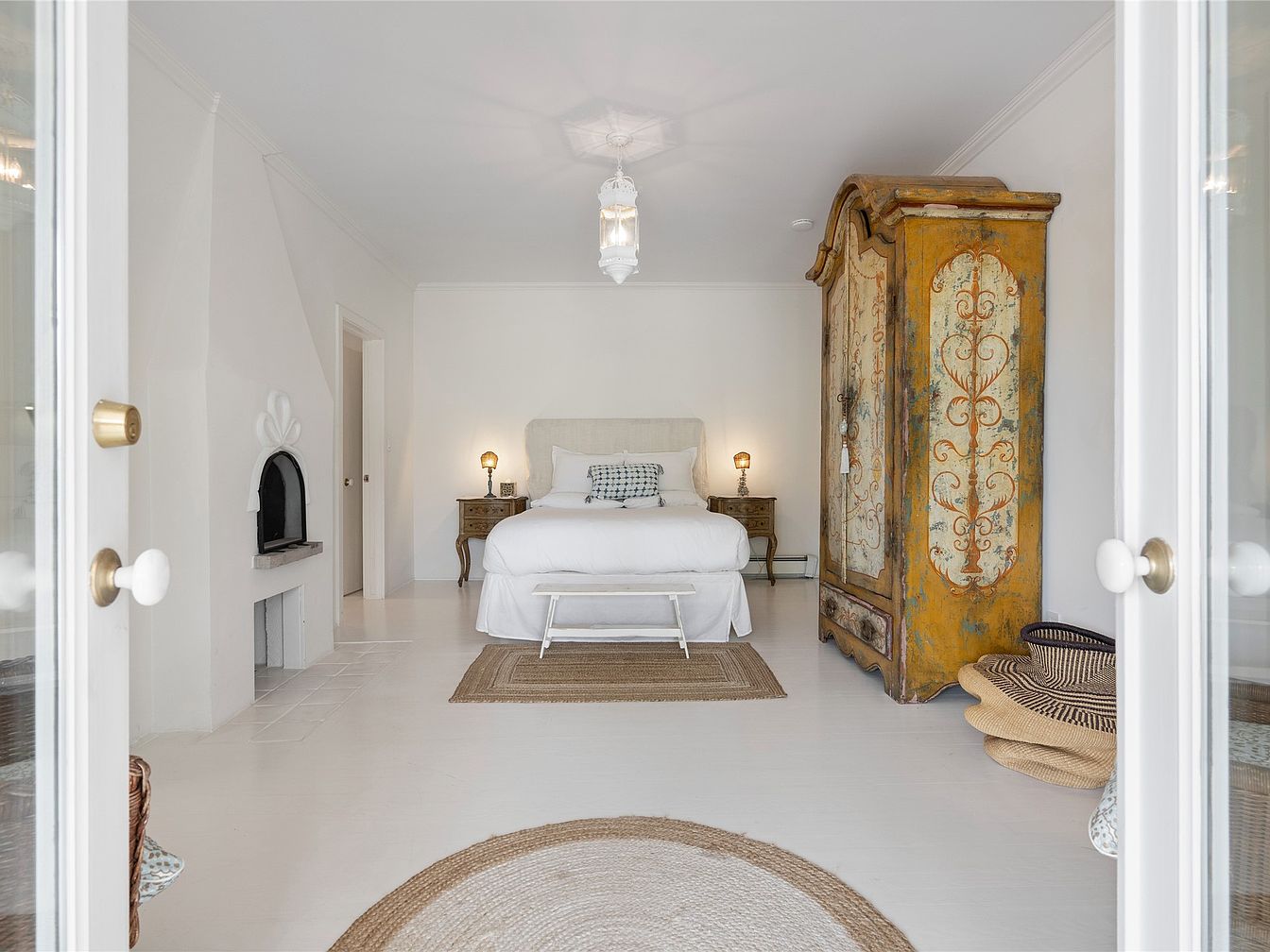 A serene master bedroom invites relaxation and comfort, featuring a soft color palette of whites and natural tones. The room showcases a plush, upholstered bed adorned with decorative pillows, flanked by elegant bedside tables, each with stylish lamps for warm lighting. Unique architectural details include a charming fireplace and a vintage wardrobe that add character and functionality. The natural light floods the space, enhancing the airy feel, while woven textures in the rugs and seating provide warmth. Perfect for family living, this bedroom balances style and comfort, making it an ideal sanctuary for rest and rejuvenation.