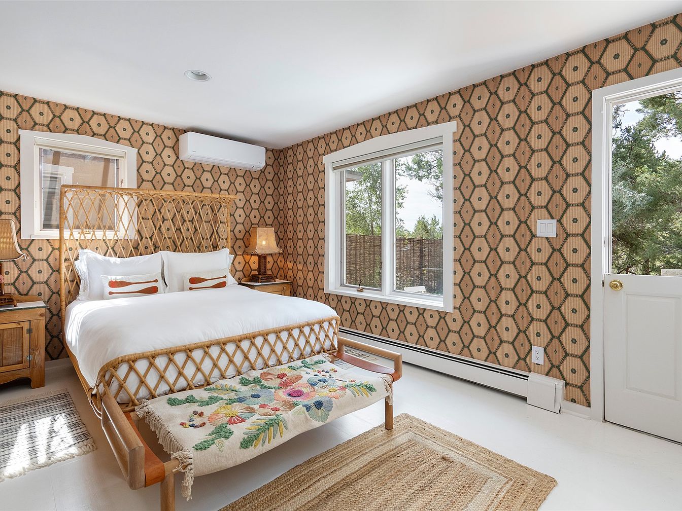 A serene bedroom featuring a unique rattan bed frame adorned with plush white bedding, complemented by stylish accent pillows. The warmth of the space is accentuated by the honeycomb-patterned wallpaper, bringing natural elements indoors. Simple wooden nightstands with warm lamps provide functional elegance, while expansive windows invite soft, natural light, creating a bright and airy atmosphere. The room’s decor includes a colorful embroidered throw, adding a touch of artistic flair, and a neutral woven rug that enhances the cozy feel. Ideal for family living, this space offers a peaceful ambiance, perfect for relaxing and unwinding.