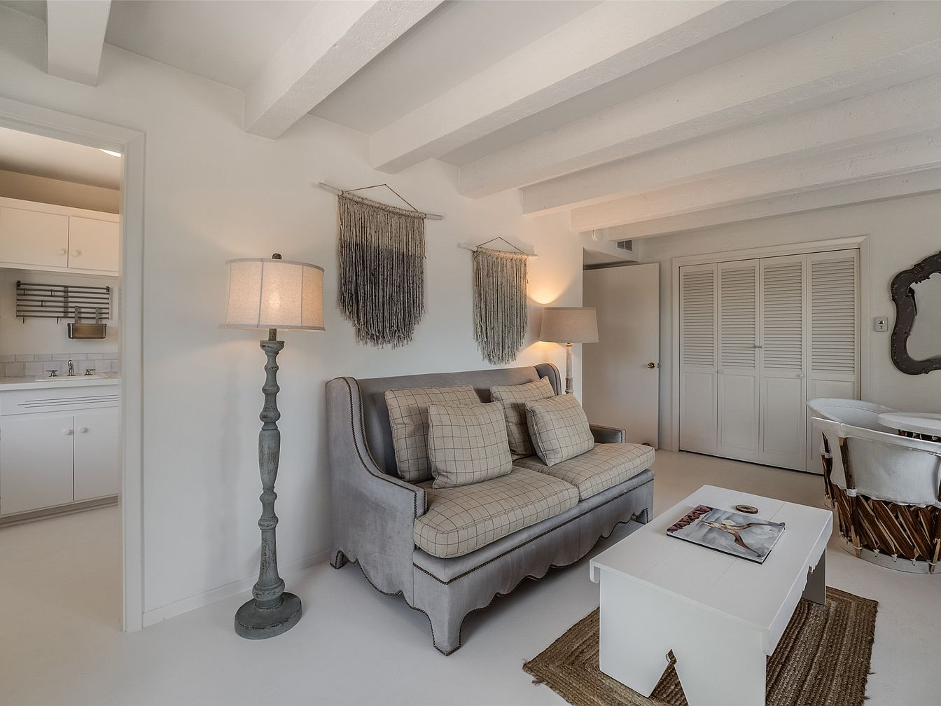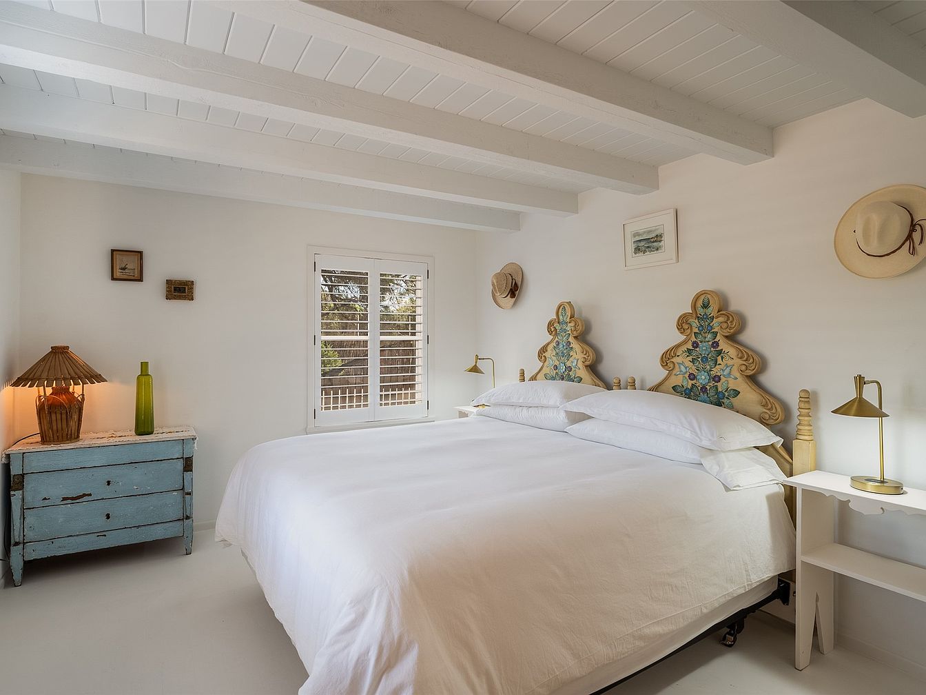 This serene bedroom features a spacious layout accentuated by whitewashed beams overhead, contributing to a light and airy ambiance. The centerpiece is a stylish bed with beautifully crafted, decorative headboards that add a touch of elegance. Light, crisp linen bedding complements the soft color scheme, while charming side tables with minimalist gold lamps provide both functionality and warmth. A distressed blue nightstand injects a subtle rustic charm. Natural light streams in through the shutters, emphasizing the inviting atmosphere. The space artfully balances comfort and style, making it a perfect sanctuary for relaxation and restful nights.