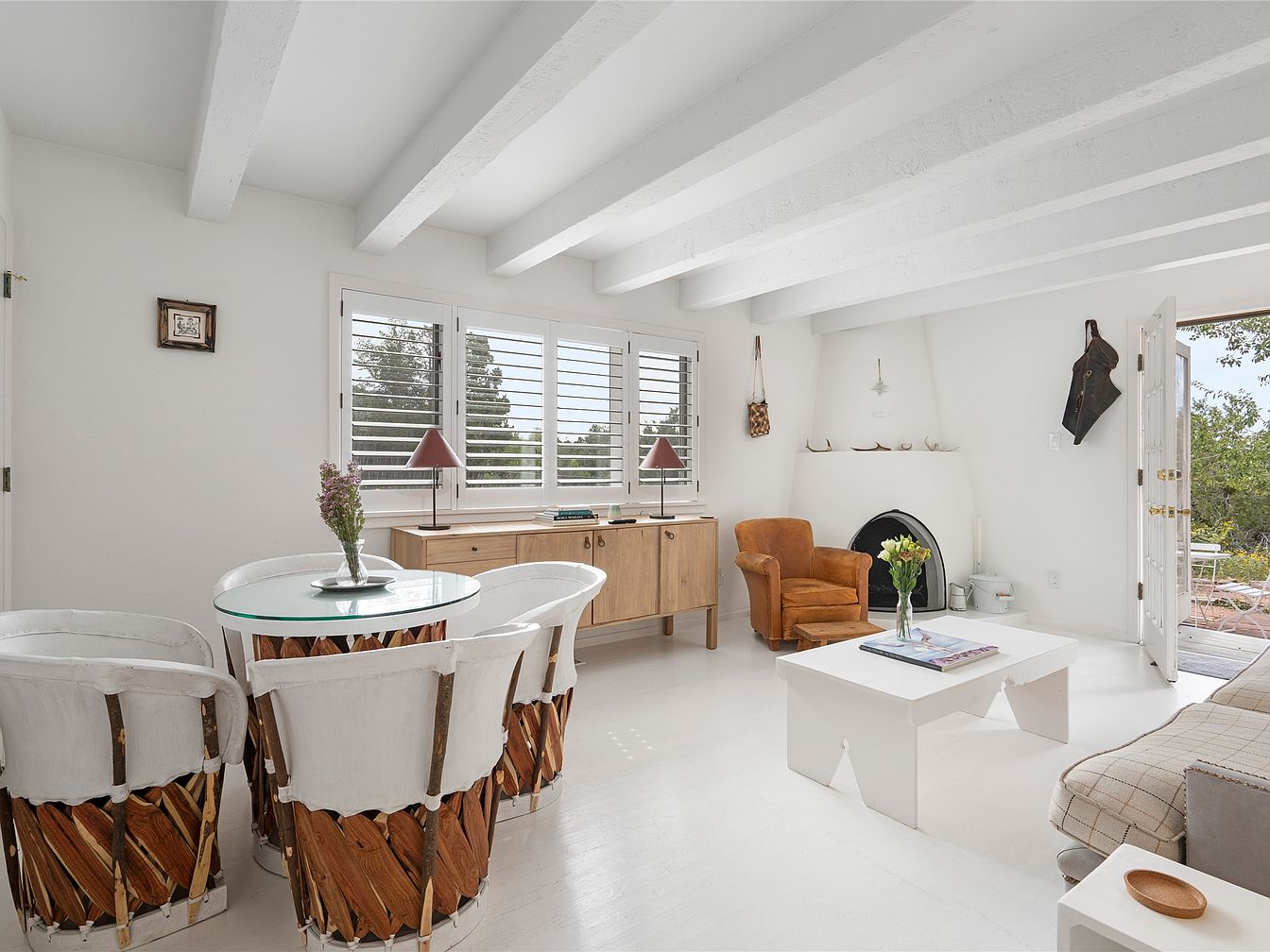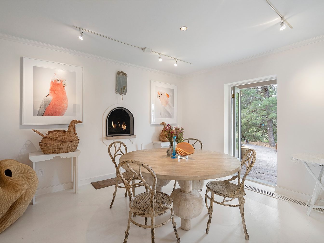 This inviting dining area seamlessly blends simplicity and comfort, featuring a round wooden table surrounded by rustic, weathered chairs that exude a warm, homey vibe. Soft hues of white and light beige create an airy ambiance, enhanced by natural light flooding through open doors leading to the outdoor space. Eye-catching artwork of vibrant birds adorns the walls, adding pops of color and personality. The elegant rounded fireplace creates a cozy focal point, perfect for intimate gatherings. The serene layout encourages family interaction, making it an ideal space for casual meals and enduring memories.