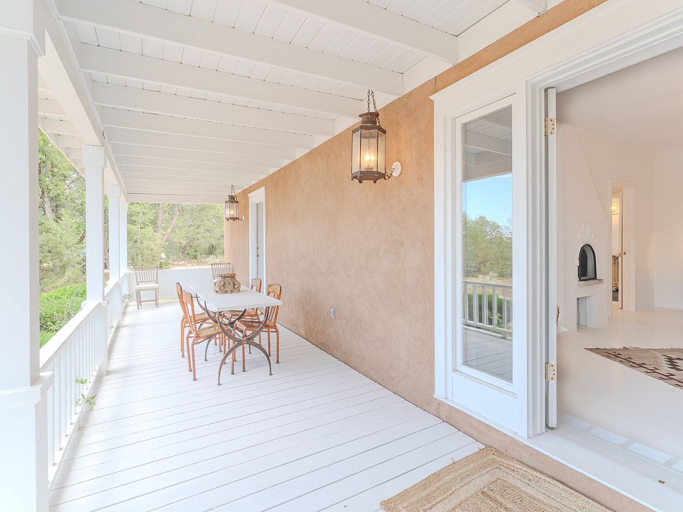 This inviting porch features a seamless blend of indoor and outdoor living, perfect for family gatherings or quiet evenings. The crisp white floorboards, complemented by robust wooden beams, echo a sense of openness and light. A rustic dining table with charming metal accents sits at the center, surrounded by eclectic seating that invites conversation. Decorative lanterns hang gracefully, casting a warm glow as dusk approaches. The earth-toned walls imbue warmth while lush greenery peeks through the balustrade, enhancing the tranquil ambiance. This space not only reflects aesthetic appeal but also serves as a welcoming retreat for family and friends.