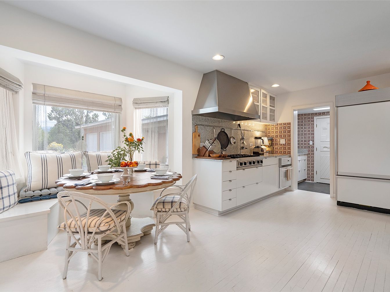 This charming kitchen features a sunlit nook with cozy built-in seating adorned with striped cushions, creating an inviting atmosphere for family gatherings. A round wooden dining table occupies the center, complemented by classic French-style chairs with soft upholstery. The sleek, minimalist cabinetry highlights modern functionality, while the striking stainless steel appliances offer a professional touch. A unique tile backsplash adds a splash of color and texture, enhancing the space’s character. Natural light pours in through generous windows, illuminating the pristine hardwood floors and reinforcing the airy, open feel of this family-oriented kitchen.