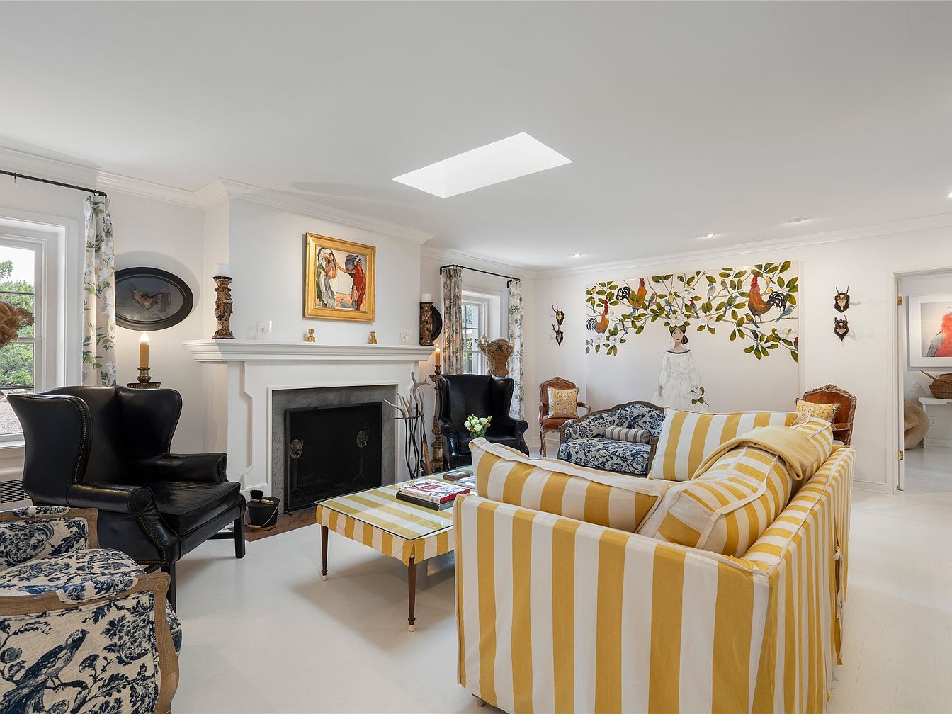 Bright and inviting, this living room balances sophistication and comfort, with a spacious layout designed for family gatherings. The striking yellow and white striped sofa serves as a vibrant focal point, complemented by intricately patterned armchairs featuring blue floral motifs. A minimalist fireplace, adorned with elegant decor, adds warmth. Natural light floods the space through large windows, illuminated further by a skylight. The artwork on the walls, portraying nature-inspired themes, creates an artistic atmosphere while retaining a playful touch. This family-friendly space invites relaxation and interaction, making it the perfect setting for cozy evenings and entertaining guests.