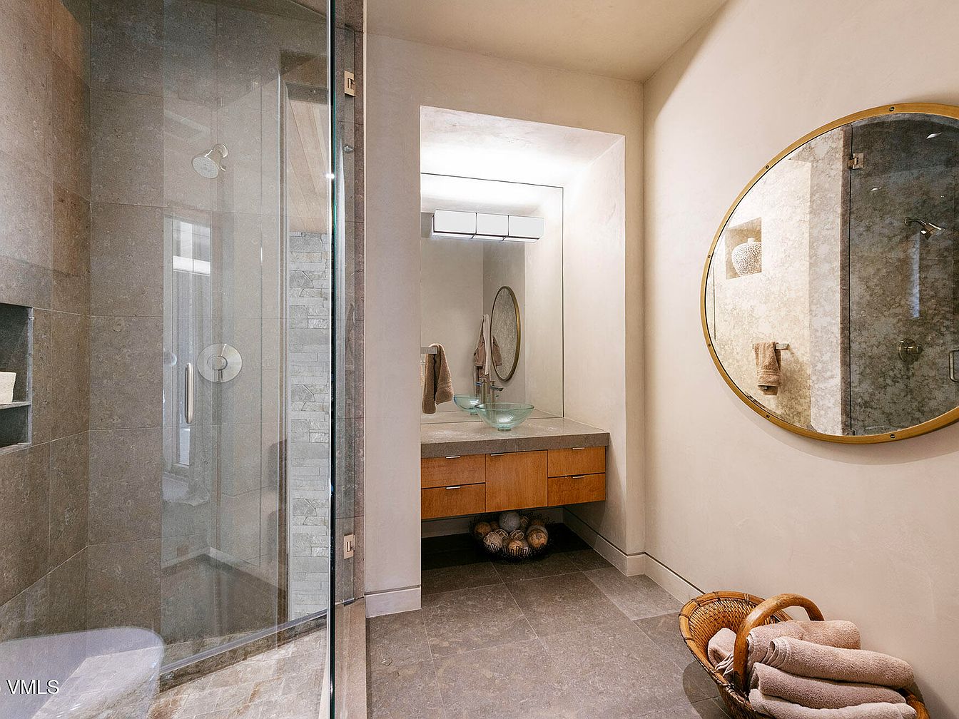 A sleek, modern bathroom showcases a spacious walk-in shower with floor-to-ceiling gray tile and a clear glass enclosure for an open, airy feel. The floating vanity features light wood cabinetry complemented by a stone countertop and a stylish glass vessel sink, adding a touch of contemporary elegance. The round mirror framed in gold above the vanity enhances the room’s warm neutral palette. Convenient shelving inside the shower and a basket of rolled towels create a welcoming, family-friendly atmosphere, while thoughtfully placed lighting and smooth surfaces deliver both sophistication and practicality to this serene bathroom retreat.