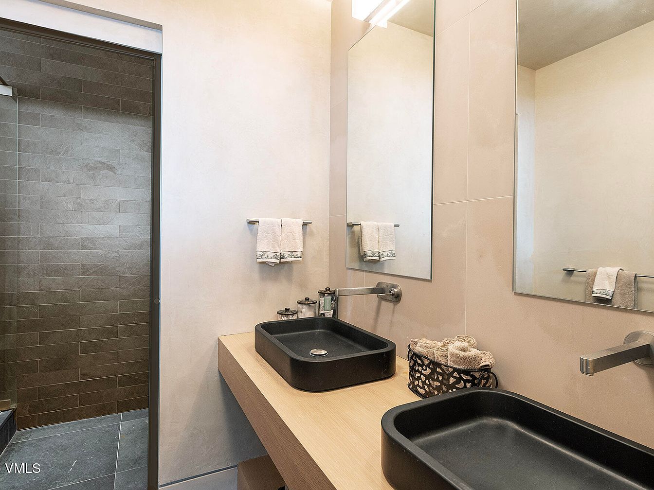 A sleek, contemporary bathroom vanity features clean lines and understated elegance. Dual rectangular black sinks sit atop a light wood floating counter, complemented by minimalist wall-mounted faucets and large, frameless mirrors that add depth and brightness. The color palette is neutral, with soft beige walls and subtle tile work in the spacious walk-in shower. Functional touches such as double towel bars, soap dispensers, and a woven basket for hand towels enhance family convenience and organization. The modern design and practical layout make it both inviting and family-friendly, ideal for busy mornings or relaxing evening routines.