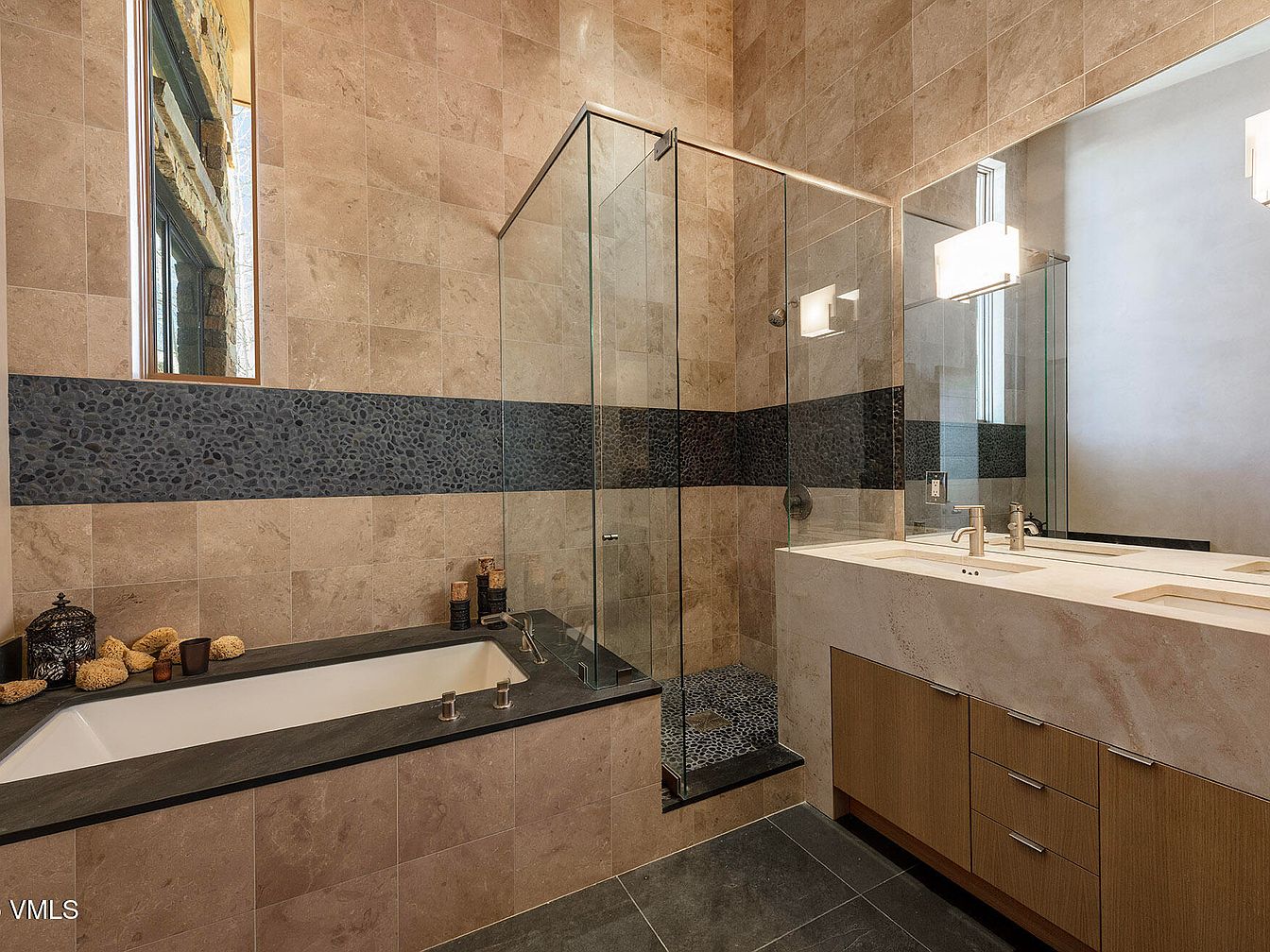Spacious and serene, this bathroom features a contemporary design with warm beige tiles covering the walls and sleek charcoal flooring that grounds the space. The walk-in glass shower and deep soaking bathtub are accentuated by a striking textured black stone band running horizontally across the room, adding visual interest and a touch of spa-inspired luxury. Dual sinks with a large, well-lit mirror provide ample space for family routines, while understated cabinetry offers abundant storage. Soft natural light flows in from a vertical window, creating a relaxing yet family-friendly environment that blends functionality with sophisticated style.