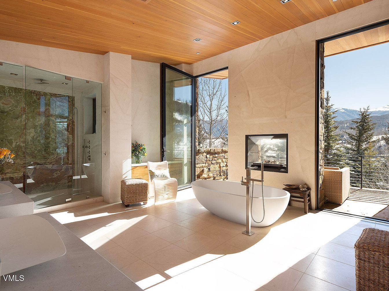 This luxurious master bathroom offers a seamless blend of indoor comfort and outdoor beauty, featuring a freestanding modern bathtub positioned by expansive glass doors that open to a balcony with mountain views. Warm wooden ceilings and soft beige stone walls create a calming, spa-like atmosphere, while abundant natural light fills the space. Family-friendly touches include ample open space for easy movement and cozy seating nooks. A large walk-in shower with glass enclosure, double vanity, and woven baskets for storage add practical functionality. Thoughtful details like a two-sided fireplace and soft furnishing provide both style and comfort, perfect for relaxation and family routines.