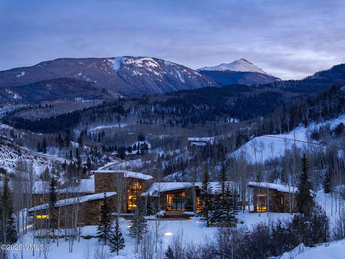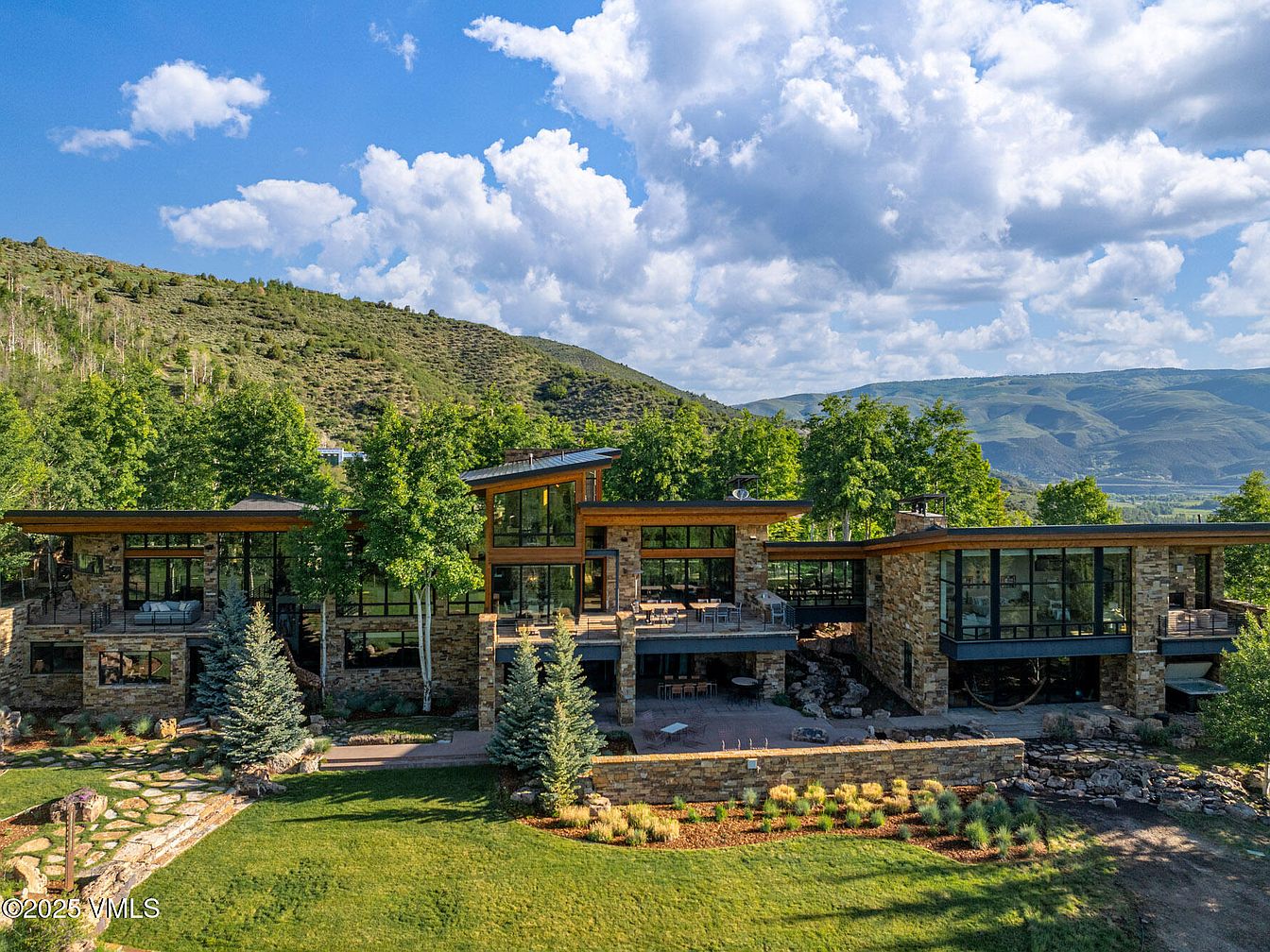 Striking contemporary architecture nestled in a lush mountain setting creates a welcoming retreat for families and entertainers alike. Floor-to-ceiling windows spread across the facade invite ample natural light while offering breathtaking mountain and valley views. The stone and wood exterior blends seamlessly with the surrounding landscape, while wide terraces and patios provide abundant space for outdoor gatherings, play, and relaxation. Layers of flat roofs and rich landscaping frame the home, reinforcing its connection to nature. The open lawn and easy stone pathways evoke a sense of openness, inviting both children and adults to explore and enjoy the grounds comfortably.