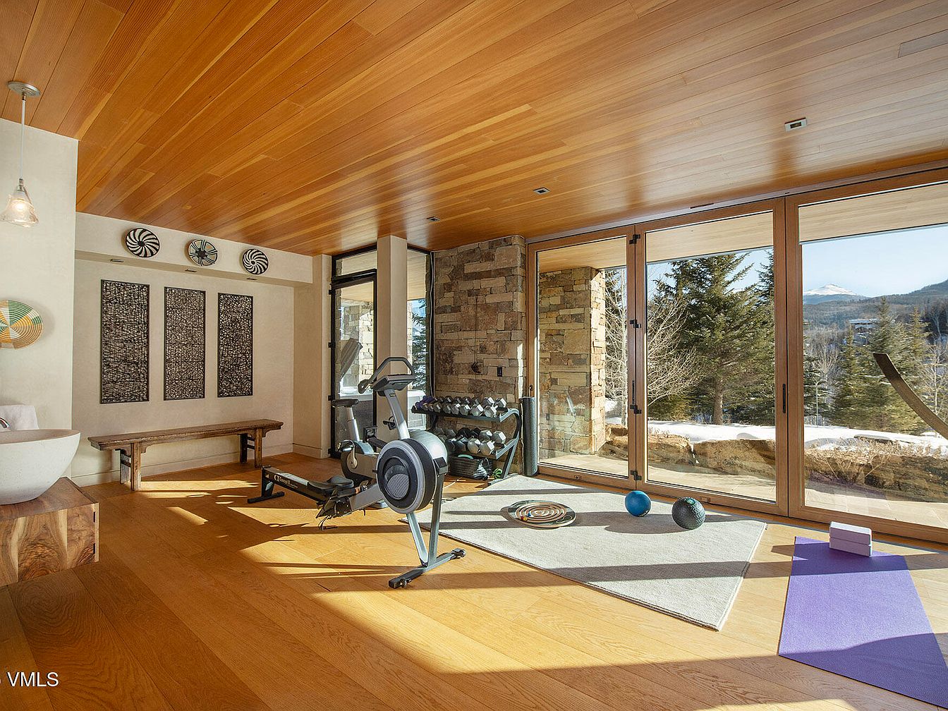 A bright, spacious home gym with full-height windows offers panoramic mountain views and ample natural light, providing a motivating environment for wellness. The room is adorned with warm wooden floors and matching wood-paneled ceilings, complemented by stone accents for a touch of rustic charm. Exercise equipment, such as a rowing machine, dumbbells, yoga mats, and medicine balls, are neatly arranged, promoting fitness for all family members. Decorative wall art, a long wooden bench, and woven baskets add style and comfort, while the open layout ensures safety and flexibility for kids and adults alike. The tranquil palette creates an inviting, uplifting ambiance ideal for daily workouts or relaxation.