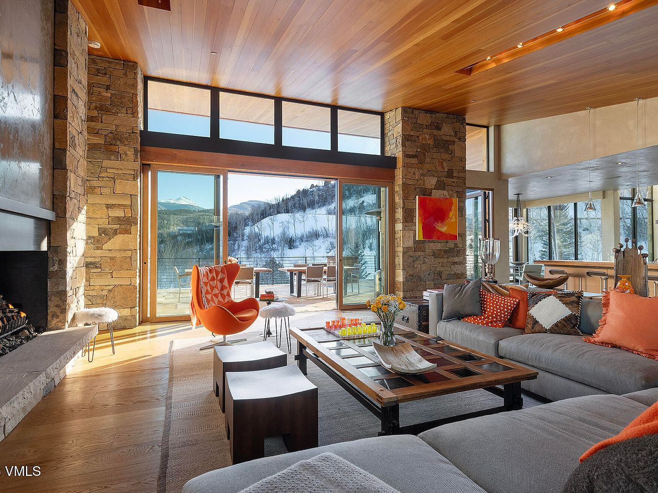 Expansive windows flood this living room with natural light and frame breathtaking mountain views, creating an inviting space that seamlessly blends indoor comfort with outdoor beauty. The layout fosters easy conversation and family gatherings, featuring a spacious sectional sofa and plush seating in lively orange accents. Warm wood ceilings and stone walls add a rustic yet modern touch, while the contemporary fireplace promises cozy evenings. Thoughtfully arranged décor, including patterned throw pillows and vibrant artwork, introduces playful color. This room balances style and comfort, making it perfect for family game nights or quiet mornings enjoying the view together.