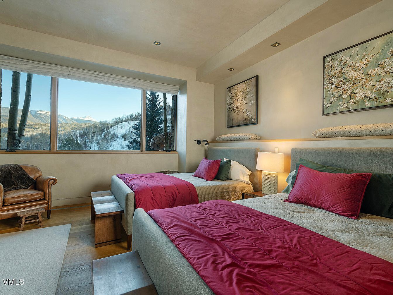 A cozy double bedroom features two plush beds with soft gray upholstered headboards and rich raspberry covers, offering a perfect setup for kids or guests. Large panoramic windows fill the space with natural light and showcase breathtaking mountain views, seamlessly connecting the indoors to the scenic outdoors. The tasteful use of neutral cream tones on the walls creates a soothing backdrop, complemented by natural wood flooring and minimalist furnishings. Delightful touches, such as matching floral artwork and gentle overhead recessed lighting, provide a welcoming atmosphere, making it an ideal family-friendly escape that balances comfort, style, and a tranquil mountain ambiance.