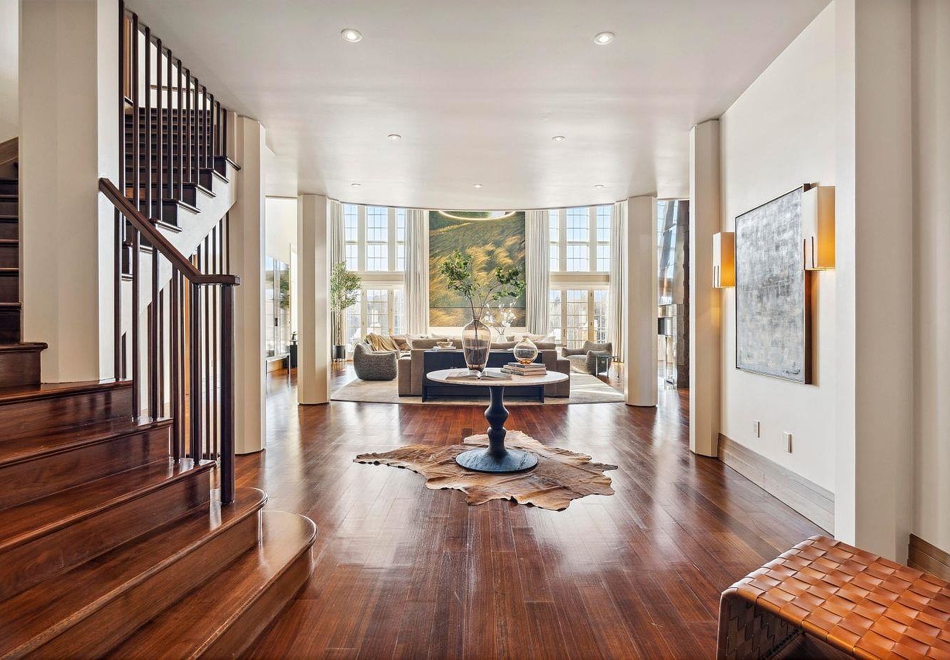 This stunning entryway seamlessly transitions into an expansive living area, illuminated by natural light filtering through large, floor-to-ceiling windows. The elegant design features rich hardwood flooring that complements the warm hues of the décor. A central round coffee table anchors the space, glistening alongside artistic vases and a chic area rug. The seating arrangement, composed of plush sofas and accent chairs, invites family gatherings and casual conversations. Architectural details like tall curtains and stylish wall sconces add sophistication, while greenery enhances the welcoming atmosphere, creating a perfect blend of comfort and modern elegance.