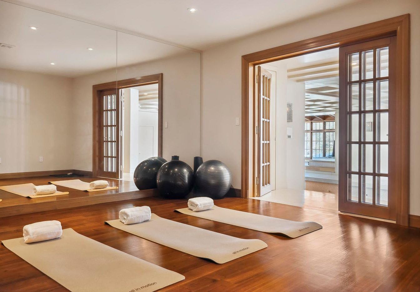 This tranquil yoga room features a warm wooden floor that complements the serene atmosphere, perfect for relaxation and fitness. Mats are neatly arranged with rolled towels, inviting a sense of calm for practice. Mirrors enhance the spacious look, reflecting light from well-placed recessed fixtures, while large French doors beckon with glimpses of adjoining living spaces. Dark exercise balls add an aesthetic contrast, providing functional yet stylish elements. The soft, neutral color palette, combined with the natural wood trim, creates an inviting space that seamlessly blends comfort with purpose, ideal for family wellness and mindfulness activities.