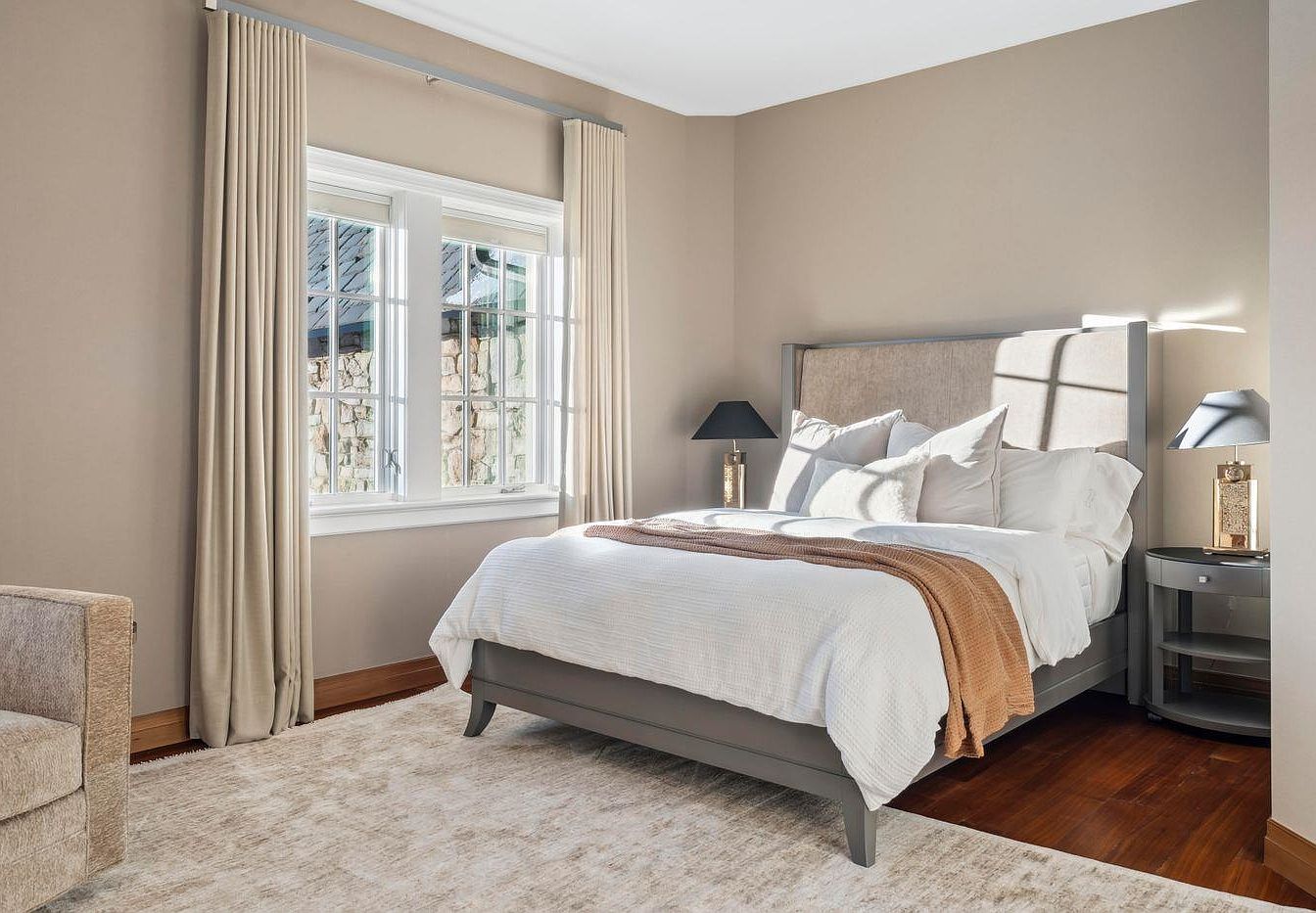 This master bedroom combines comfort and elegance with a serene color palette of soft neutrals, promoting relaxation. The spacious layout features a plush bed adorned with decorative pillows and a warm throw, ensuring a cozy ambiance. Elegant drapes frame large windows, allowing natural light to flood the room while offering views of the outdoor landscaping. The dark wood flooring contrasts beautifully with a soft area rug, adding warmth underfoot. Modern bedside lamps provide gentle lighting, enhancing the room’s soothing atmosphere. Thoughtfully designed for family living, this space balances style and practicality, creating an inviting retreat.