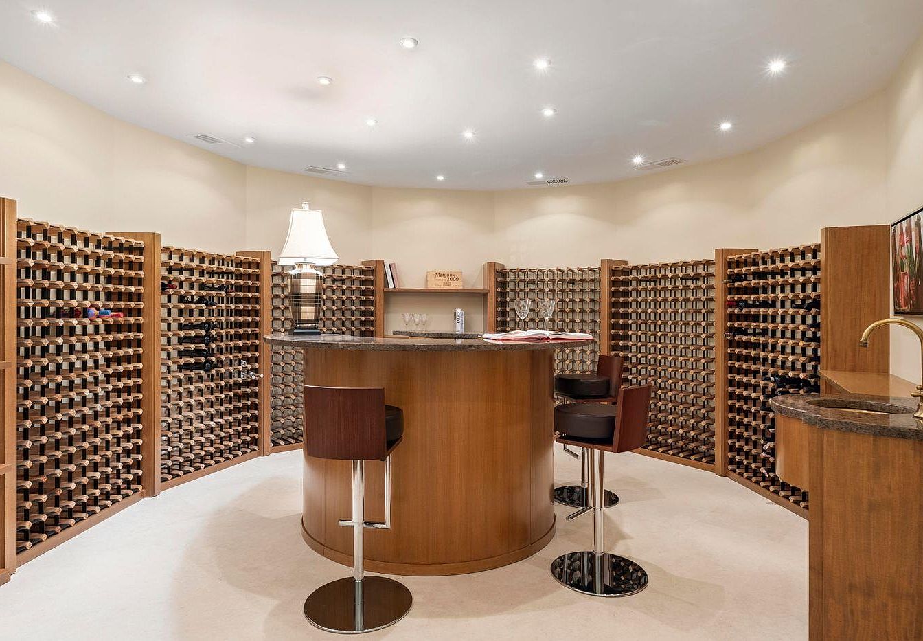 This sophisticated wine cellar features an elegantly curved design, showcasing custom-built wooden racks that elegantly display an extensive wine collection. The rich tones of the wood complement the smooth, dark granite countertop of the central bar, where stylish stools invite relaxation. Soft, recessed lighting enhances the warm ambiance while highlighting the meticulously arranged bottles. A classic lamp adds a touch of elegance, creating a cozy space perfect for entertaining guests or enjoying a quiet moment. The layout encourages interaction, making it an ideal spot for family gatherings or intimate wine tastings.
