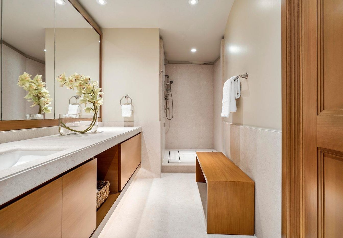 This luxurious bathroom combines elegance and functionality. Neutral tones of soft cream and beige create a calming atmosphere, enhanced by the sleek, light-colored stone countertop and wood cabinetry. A spacious mirror stretches across the sink area, reflecting natural light and visually enlarging the space. The minimalist design includes a contemporary shower with glass enclosure, allowing for easy accessibility. A thoughtfully placed wooden bench adds a touch of warmth and offers practicality for family use. Fresh floral arrangements introduce a hint of nature, completing the aesthetic while ensuring the bathroom is both stylish and inviting for all.
