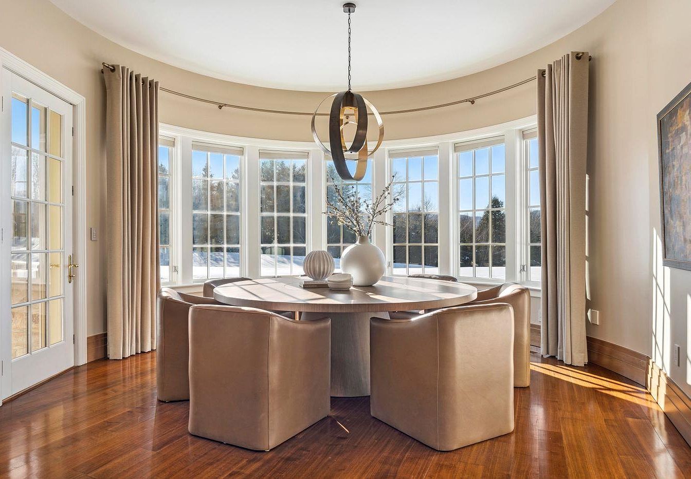 This contemporary dining area features a sophisticated round table surrounded by plush, ivory upholstered chairs, perfect for family gatherings or intimate dinners. The room is bathed in natural light streaming through the expansive bay windows, enhancing the warm, neutral color palette of warm beige and natural wood tones. Elegant drapery frames the windows, creating a cozy atmosphere. A striking circular chandelier adds a modern touch, harmonizing with the minimalist decor. The high-quality hardwood flooring complements the refined aesthetic, while the thoughtful arrangement encourages conversation and connection, embodying a family-friendly space that merges style with comfort.