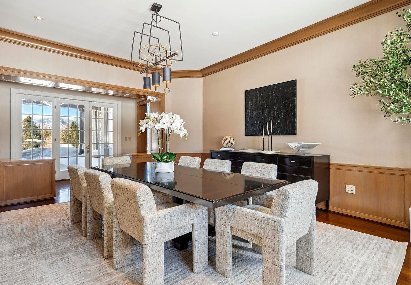 The dining room features a contemporary design, showcasing a sleek black dining table surrounded by plush, textured chairs that add warmth and comfort. Architectural details such as the rich wood paneling and decorative crown molding enhance the space’s elegance. A striking chandelier hangs above the table, providing a modern touch and inviting ambiance. Natural light floods in through French doors, connecting the indoors with outdoor views. A minimalistic sideboard offers practical storage while displaying tasteful decor, including a chic vase of orchids and modern art pieces, creating a perfect setting for family gatherings and entertaining guests.