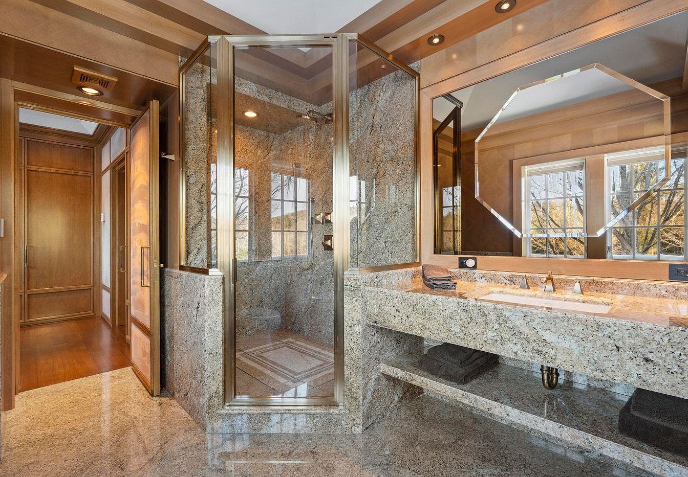 This stunning bathroom features a sleek granite stone design, offering a perfect blend of elegance and function. A spacious walk-in shower with a glass enclosure draws attention, illuminated by natural light streaming through large windows, creating a serene ambiance. The double vanity enhances comfort with ample counter space and stylish fixtures, complemented by a chic octagonal mirror that adds a contemporary flair. Rich wood accents and warm tones lend warmth to the modern aesthetic, while easy-to-clean surfaces cater to family-friendly convenience. This bathroom is a perfect sanctuary for relaxation and rejuvenation in any home.