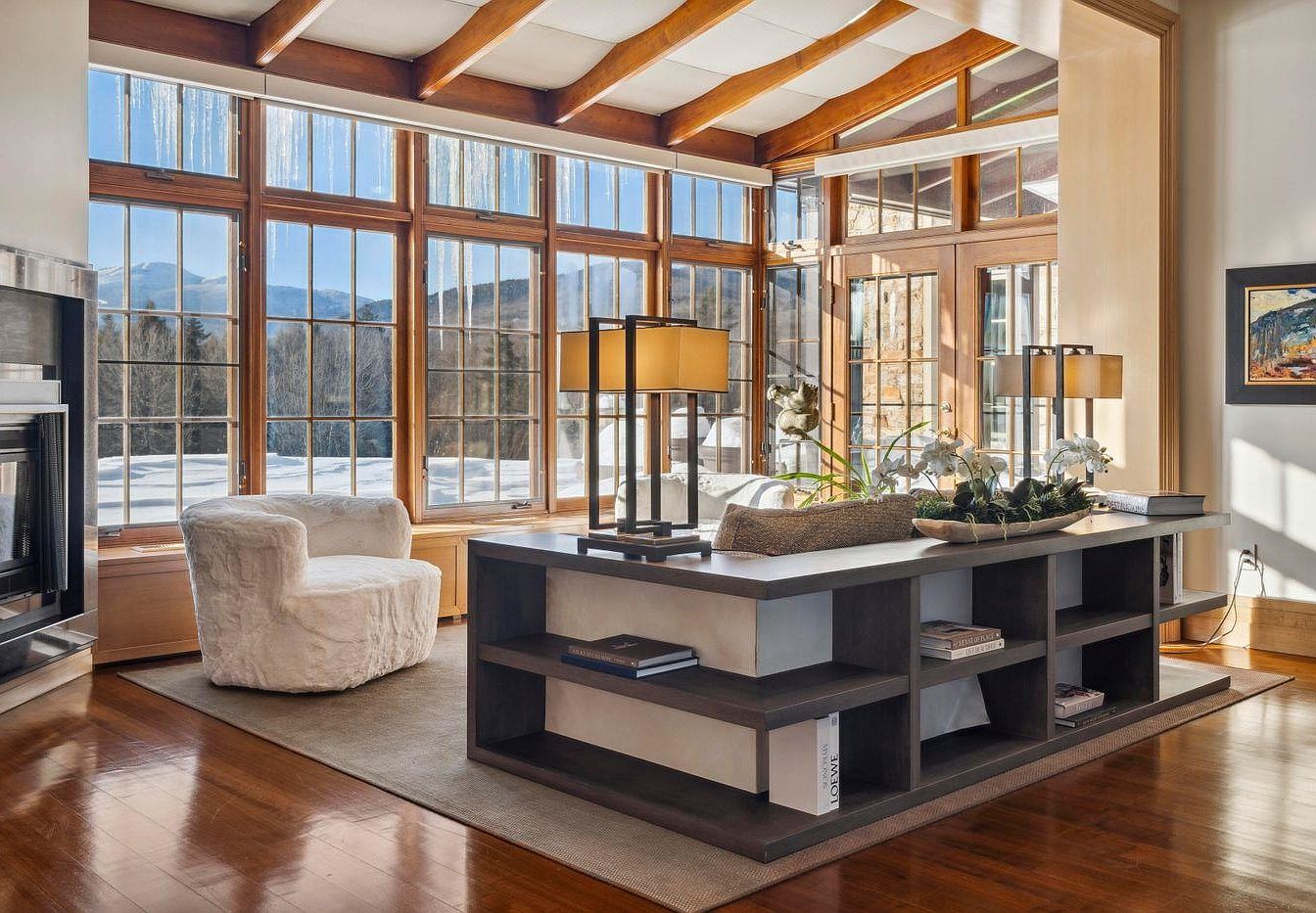 This bright living area showcases expansive windows framed in rich wood, inviting natural light and stunning mountain views into the home. The open layout creates a welcoming atmosphere, ideal for family gatherings or quiet evenings. A cozy, upholstered chair sits on a textured area rug, complementing the warm wooden flooring. The modern coffee table features multiple shelves, offering practical storage and decorative display options for books and plants. Soft hues of cream and brown dominate the color scheme, evoking a sense of comfort, while the unique light fixtures add an element of contemporary elegance.