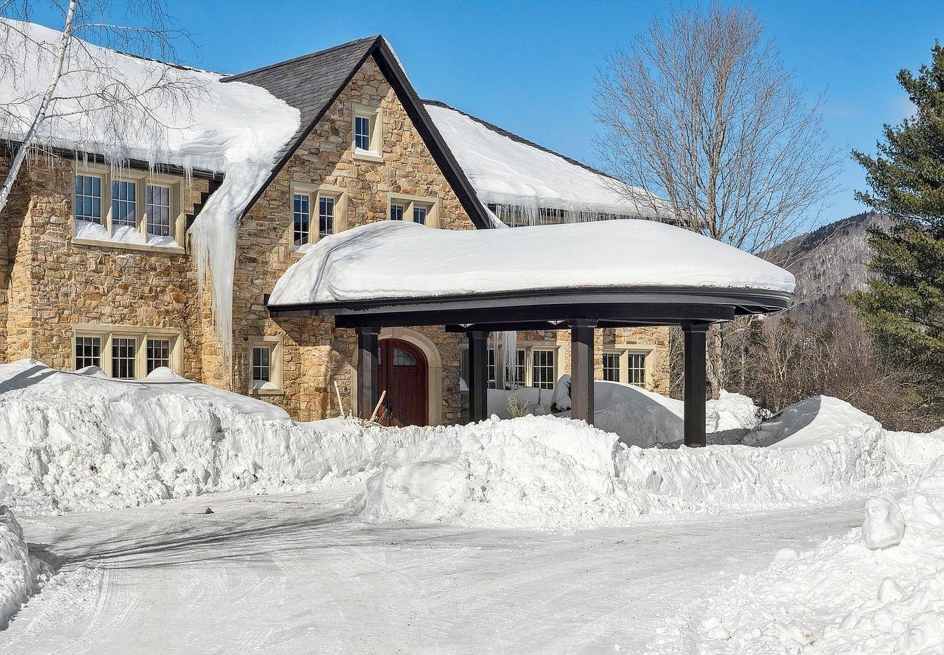 This stunning entryway features a beautifully architected stone façade complemented by large windows that invite ample natural light. The expansive covered porch, supported by sturdy wooden beams, provides a welcoming spot for family gatherings or a cozy retreat from the snow. With its warm wooden door, the entrance exudes a classic charm, while the surrounding snow emphasizes the serene winter landscape. The neutral color palette of the stone creates a harmonious balance with the deep blue sky, enhancing the home’s inviting atmosphere. Ample space in the driveway ensures easy access and convenience for family and guests.