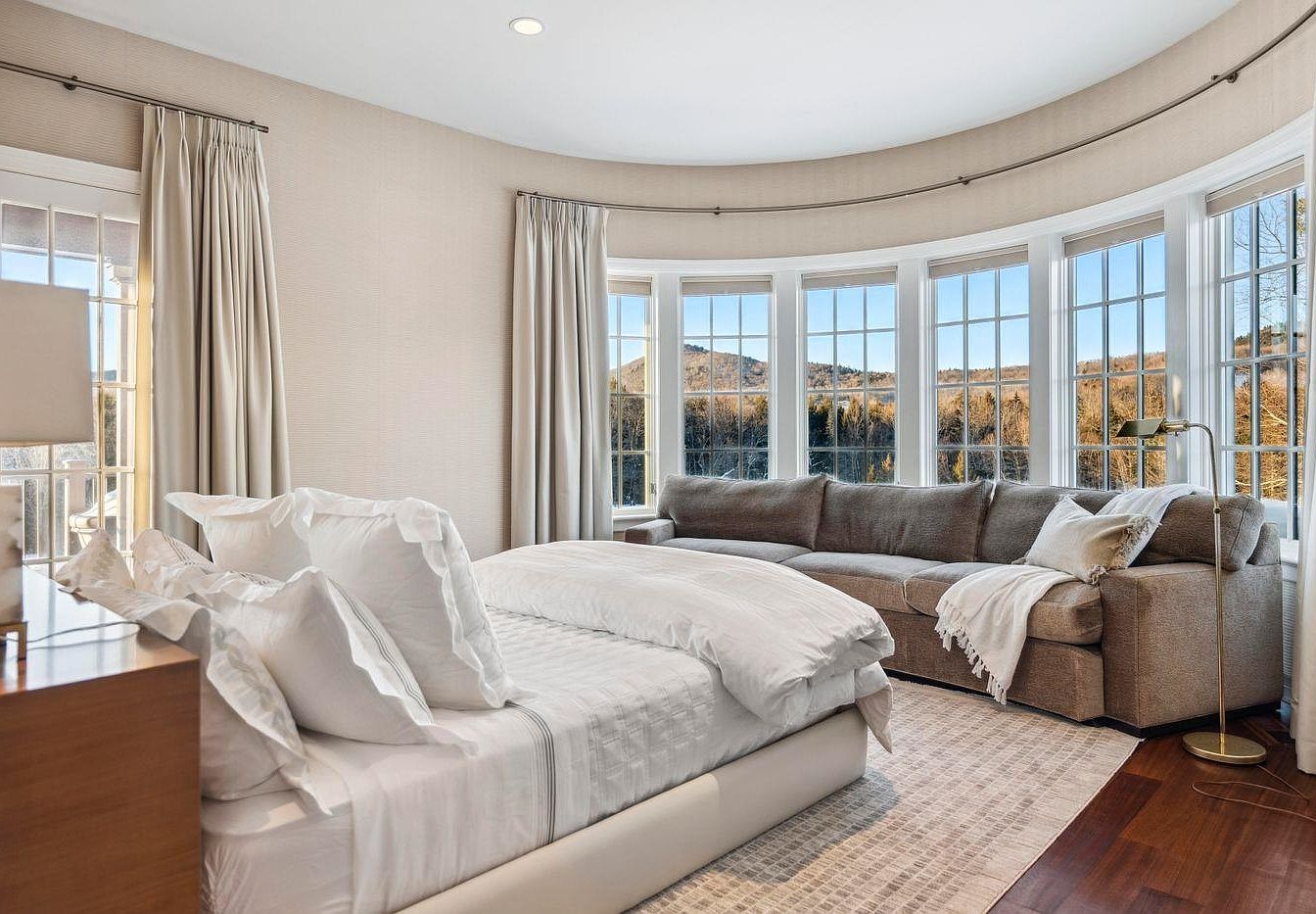 This master bedroom retreat features a serene layout with a spacious design and large bay windows that invite abundant natural light while offering stunning mountain views. Soft, neutral color tones adorn the walls and furnishings, creating a calming atmosphere. The bed, dressed in crisp white linens, is complemented by elegant ruffled pillows, providing both comfort and style. A cozy, plush sofa in a warm gray hue invites relaxation, and the wooden flooring adds warmth and richness to the space. Stylish curtains frame the windows, enhancing the room’s elegance, making this a perfect haven for restful nights and peaceful mornings.