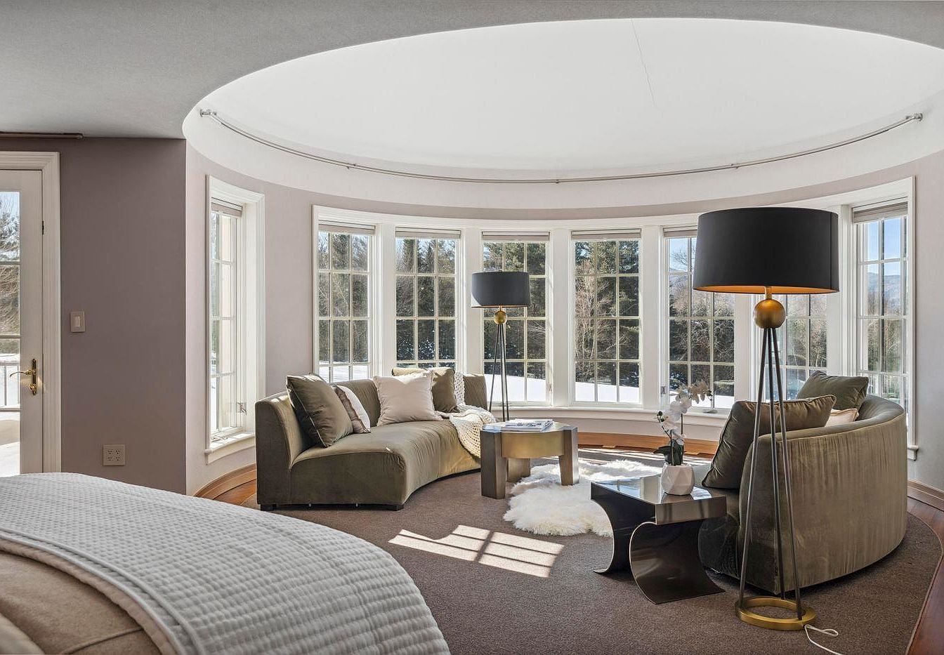 This charming living nook features a beautifully curved design, emphasizing comfort and elegance. Soft, muted colors, such as light beige walls and rich earth tones in the furniture, create a warm atmosphere. Cozy, oversized seating encourages relaxation, complemented by plush cushions and throws. Large bay windows flood the space with natural light, offering picturesque views of the outdoors. A sleek, modern coffee table adds a contemporary touch, while a stylish floor lamp enhances the cozy ambiance. The circular ceiling design draws the eye upward, providing a unique architectural detail, making this space perfect for family gatherings or quiet retreats.