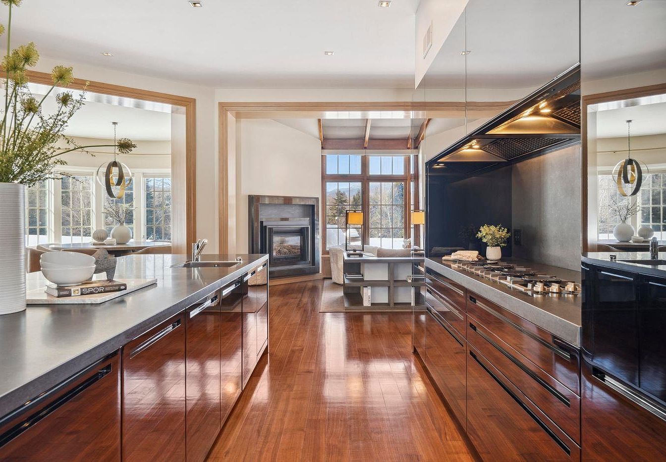 This contemporary kitchen showcases a seamless blend of functionality and aesthetic appeal. Featuring sleek, dark cabinetry with reflective surfaces, it enhances the sense of space. The expansive countertop offers ample workspace, while the efficient layout promotes family interaction. Engineered wood flooring warms the room, contrasting beautifully with the stainless steel appliances and fixtures. Natural light floods the space through large windows, creating an inviting ambiance. A stylish island doubles as a breakfast bar, perfect for casual dining or entertaining. The modern fireplace in the adjoining living area adds a cozy touch, completing this beautiful open-concept design.