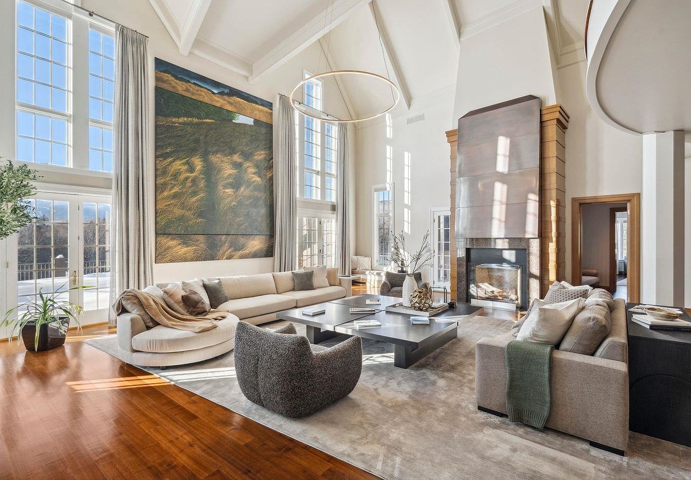 This spacious living room features soaring vaulted ceilings and an abundance of natural light streaming through large windows, creating a bright and airy atmosphere. The plush sectional sofa invites relaxation, accentuated by soft throw pillows and a cozy blanket. A stylish coffee table serves as a focal point, surrounded by textured armchairs for comfort. The hardwood floors add warmth, while the large artwork above the fireplace beautifully complements the neutral color palette. Elegant drapes frame the windows, enhancing the room’s sophistication. With its inviting layout and family-friendly features, this space is perfect for gatherings and leisure.