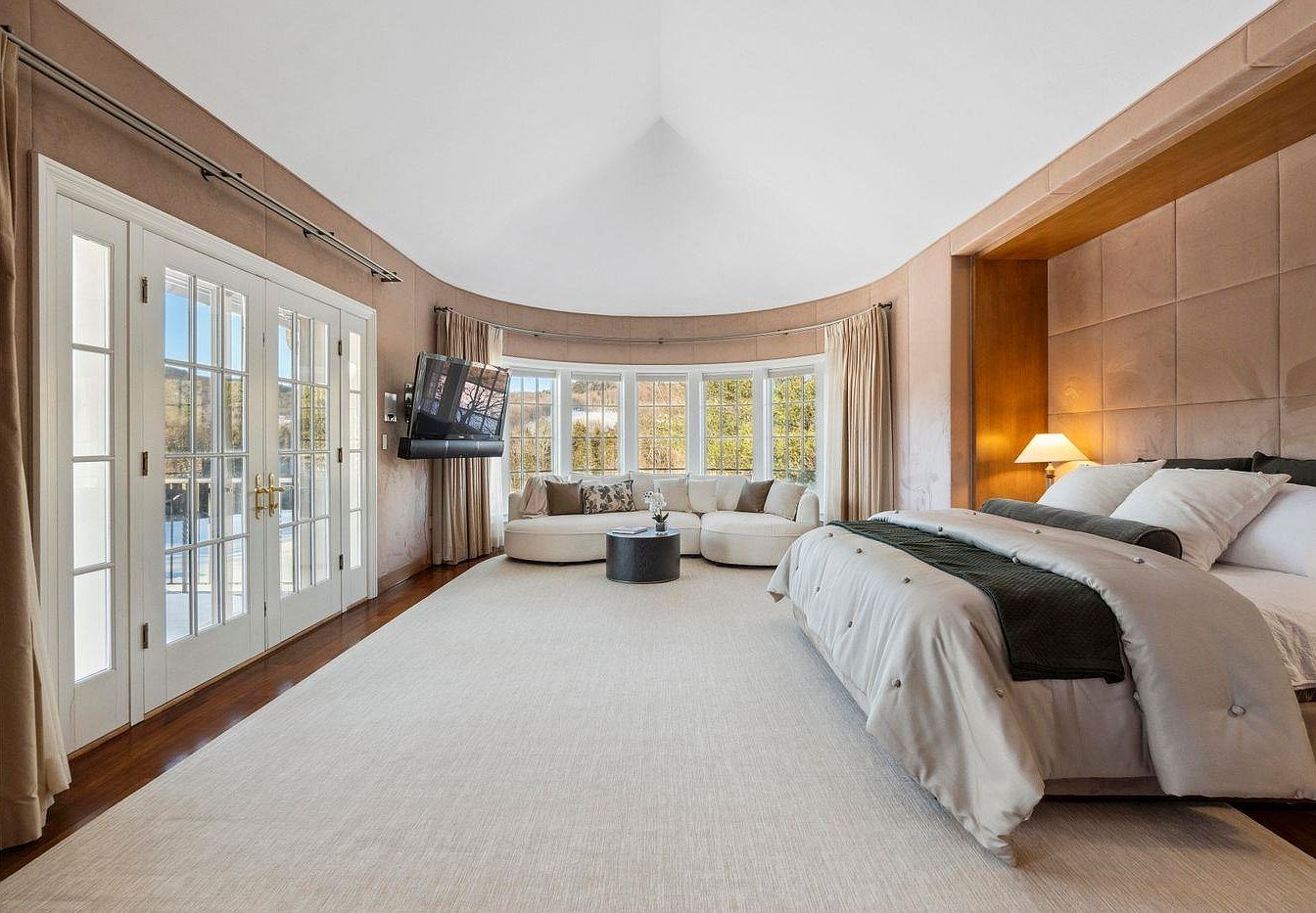 This spacious master bedroom features a harmonious blend of comfort and elegance. A vaulted ceiling enhances the airy ambiance, while soft beige walls and luxurious carpeting create a warm, inviting atmosphere. A plush, oversized bed is adorned with stylish linens, accented by a rich, textured headboard. Adjacent, a cozy seating area with circular couches invites relaxation, framed by expansive bay windows that flood the space with natural light. Elegant drapery gracefully frames the views, while a modern flat-screen TV adds functionality. Dual French doors lead to a private outdoor space, seamlessly connecting indoor comfort with nature.
