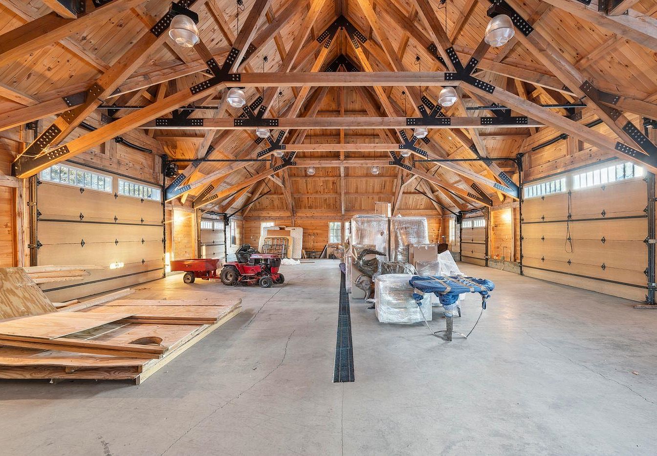 This expansive garage features a magnificent vaulted ceiling with stunning timber beams, creating a warm and inviting atmosphere. The rustic wooden walls showcase a natural aesthetic, complemented by sleek concrete flooring for durability. Practicality shines through the dual large garage doors, providing easy access for vehicles and equipment. Ample storage is afforded by the open layout, ideal for organizing tools and supplies. Family-friendly features include adequate room for recreational vehicles and outdoor gear, ensuring a versatile space for all hobbies. Soft lighting fixtures enhance visibility while maintaining a cozy environment, making it a perfect multifunctional area.