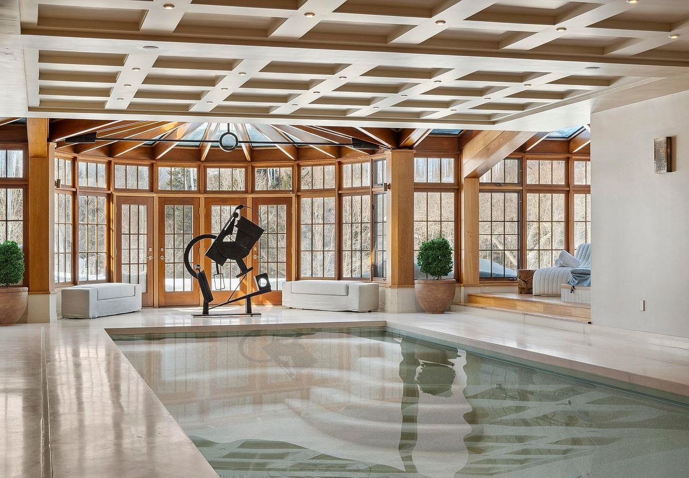 This stunning indoor pool area radiates luxury and comfort. The spacious design features a gleaming pool surrounded by sleek, polished marble floors, creating an inviting atmosphere. Natural light floods in through expansive, floor-to-ceiling windows, complemented by an elegant wood frame that enhances the warm ambiance. Modern, minimalist furniture is strategically placed for relaxation, while a unique sculpture adds a touch of artistic flair. The color palette blends soft whites and natural wood tones, fostering a serene retreat, perfect for family gatherings or tranquil moments. Thoughtfully designed for family-friendly enjoyment, it embodies both style and functionality.